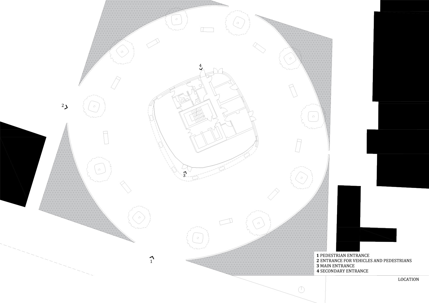 The design imputs were to realize a large number of residential units with attached services in a very small lot and to give an impetus and a new sign to the city's historic center. To meet the first criterion, one could only think of a building with vertical development, which also allows the use of the remaining outer space urban square. For the second, the architects invent an aesthetic that contrasts with tradition