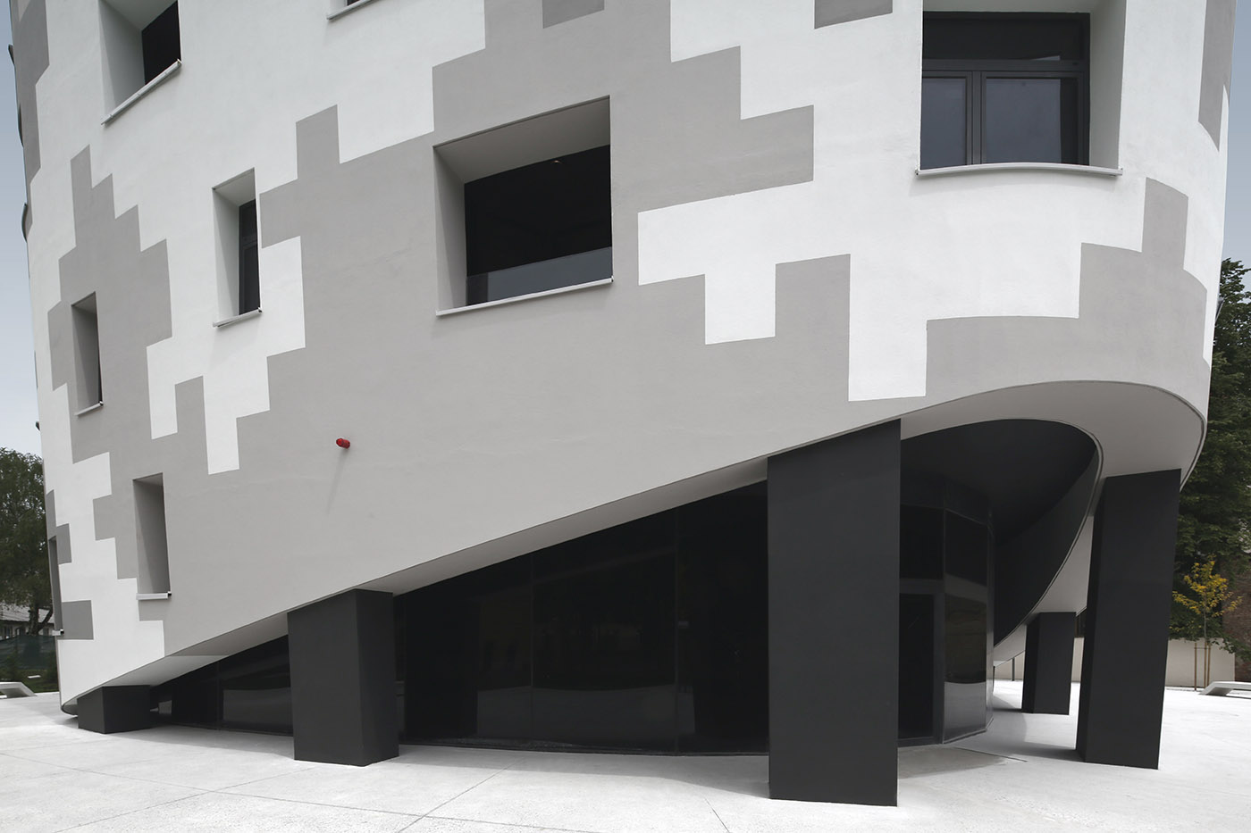 A new object then, the MORpH, modern in every element and consciously separated from the pre-existing context: a volume is fluid as opposed to traditional cubic ones. The façade is asymmetrical in its heterogeneous structure and is achieved by perforating the monolithic canvas of the wall with loggias and windows and superimposing a stylized, pixelated decorative motif along the entire skin of the building