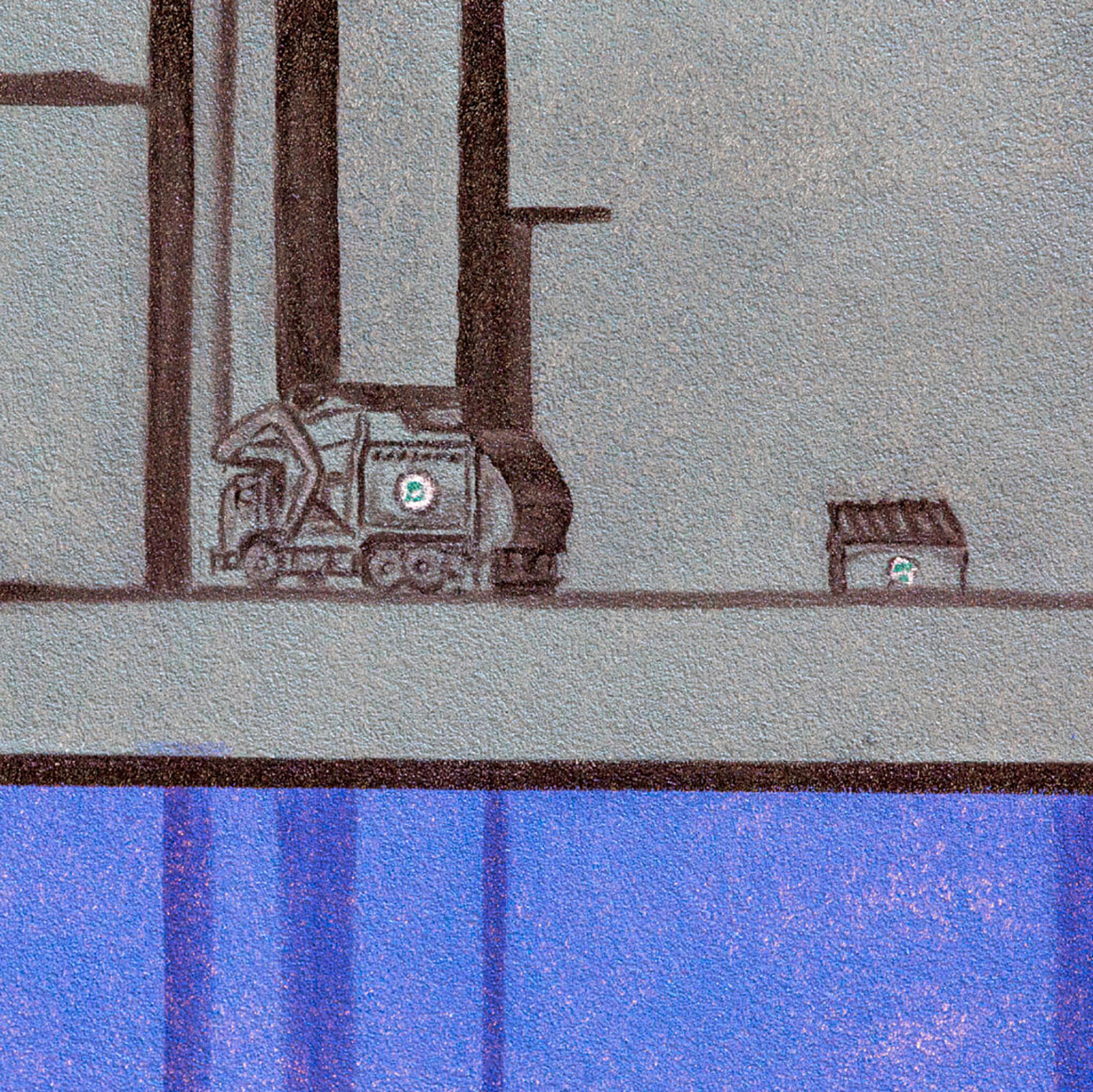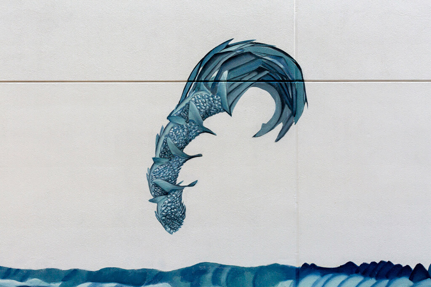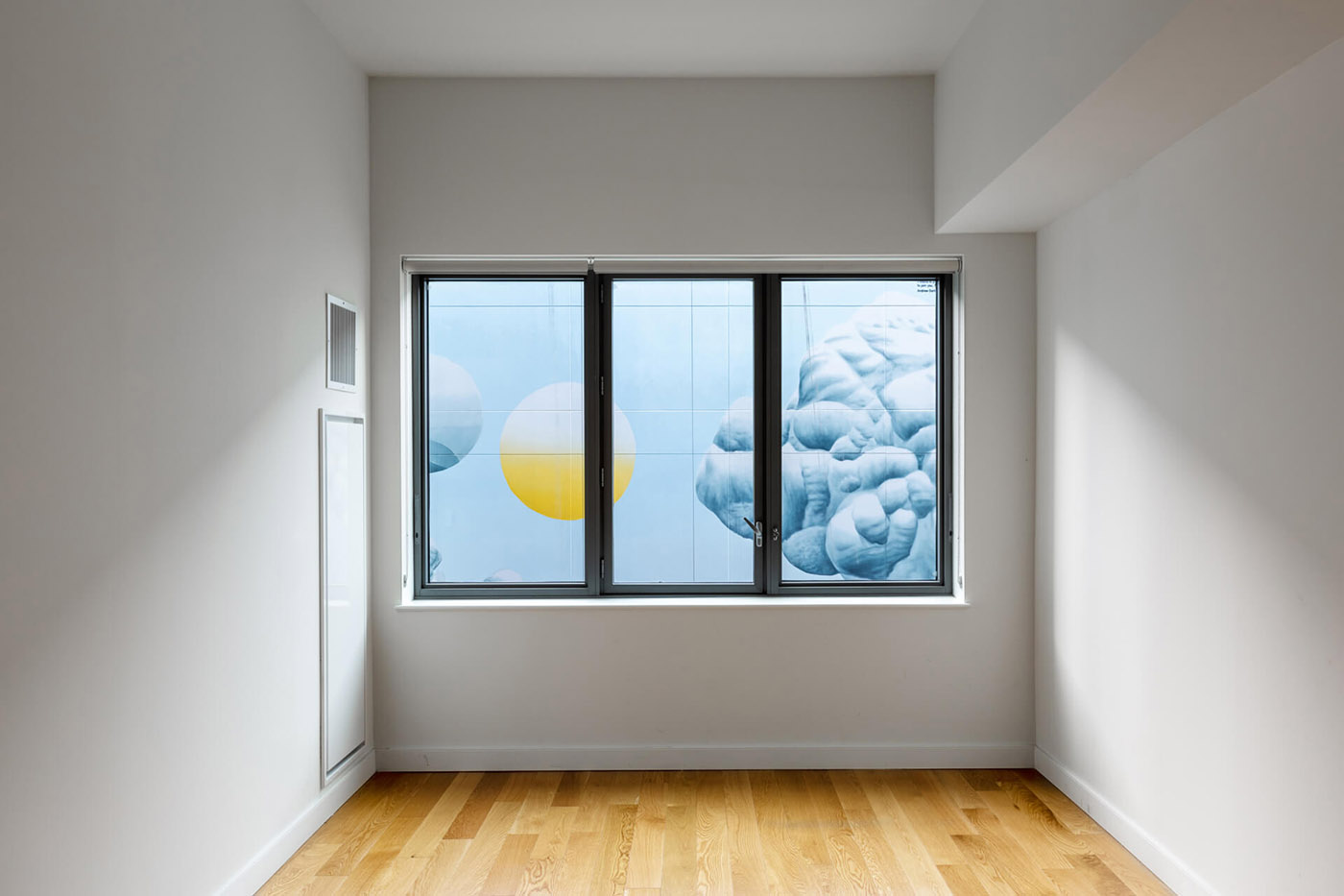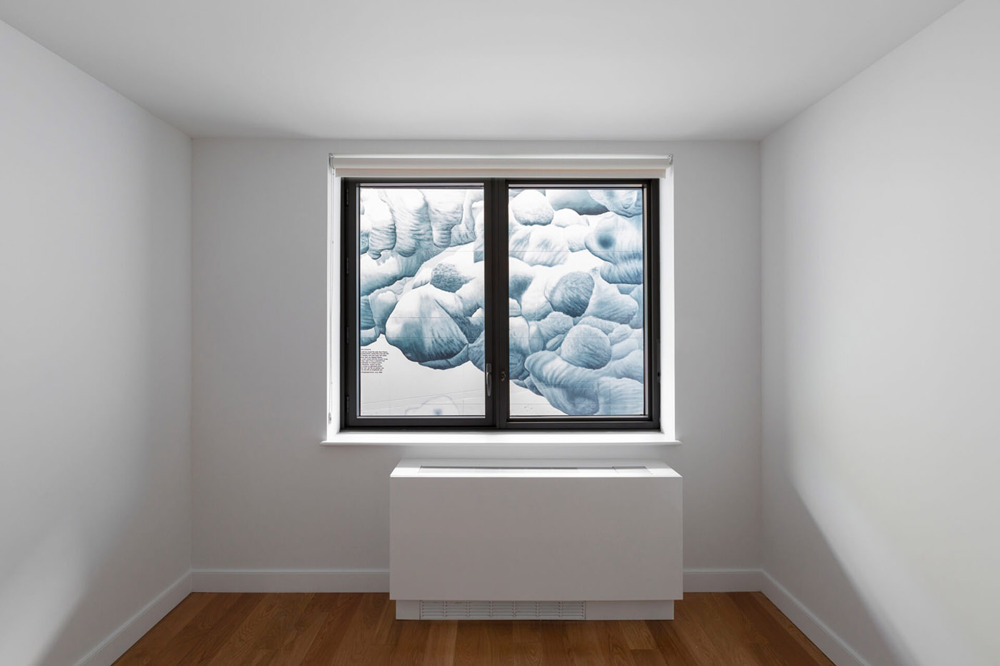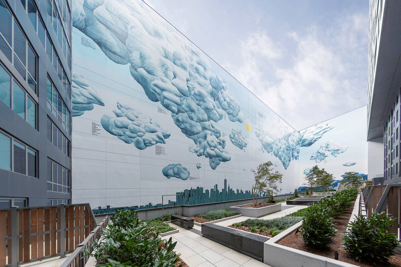 Avec autant de résidents regardant le mur depuis leurs maisons ou depuis la cour et la terrasse, il était presque obligatoire de réaliser une fresque artistique peinte. Le design présente une représentation futuriste d'un paysage nuageux tridimensionnel au-dessus de la ville de New York peuplée de créatures ailées.