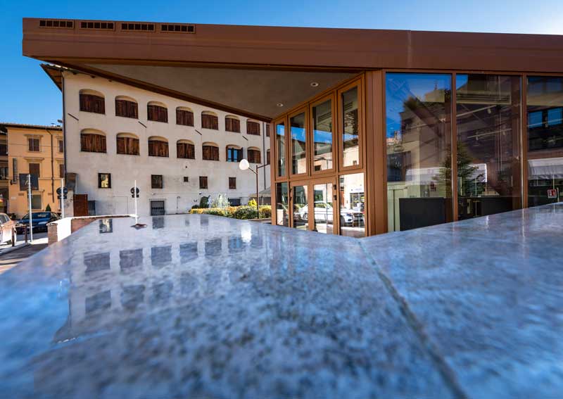 In the central area, a perforated corten circular structure recalls the presence of the old chimney and furnace. Crystal bricks allow a warm light to filter through, evoking the element of fire.