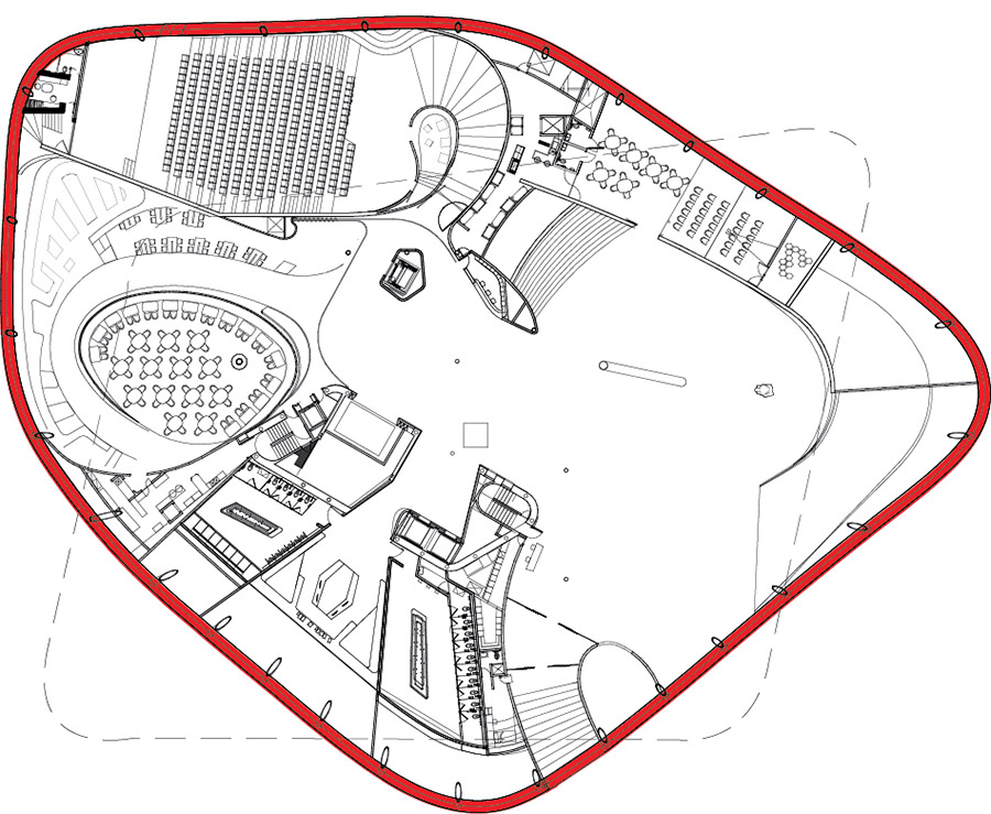 The structure of the building consists of 28 curved steel columns of different diameters, each having its own geometry and shape. Located at each level, seven rings form the system that covers the structure and ensures its stability. The roof of the building is opaque, offering a central opening to the outside. The façade consists of 16.000 hexagonal aluminium modules to optimise the conservation and durability of the entire building