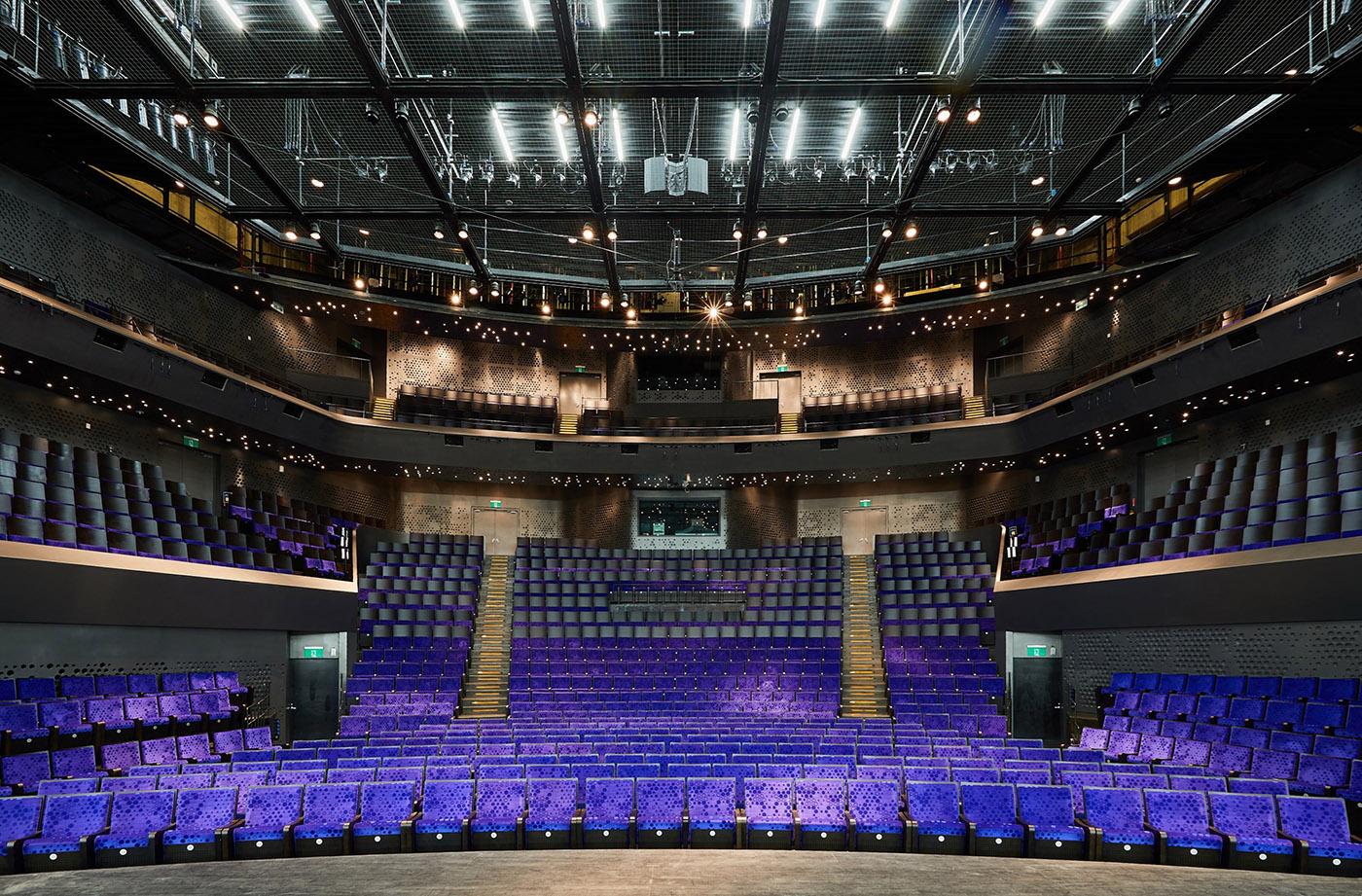 Les théâtres, la Salle de Concerts (1 981 places), l'Opéra (2 236 places), la Salle de Récital (434 places) et la Salle de Jeu (1 210 places), sont situés dans les cinq noyaux de bâtiments formés par la jonction de la structure avec le sol. Les noyaux sont interconnectés par des vestibules sur le toit et un niveau de service souterrain qui abrite les "coulisses" de chaque théâtre