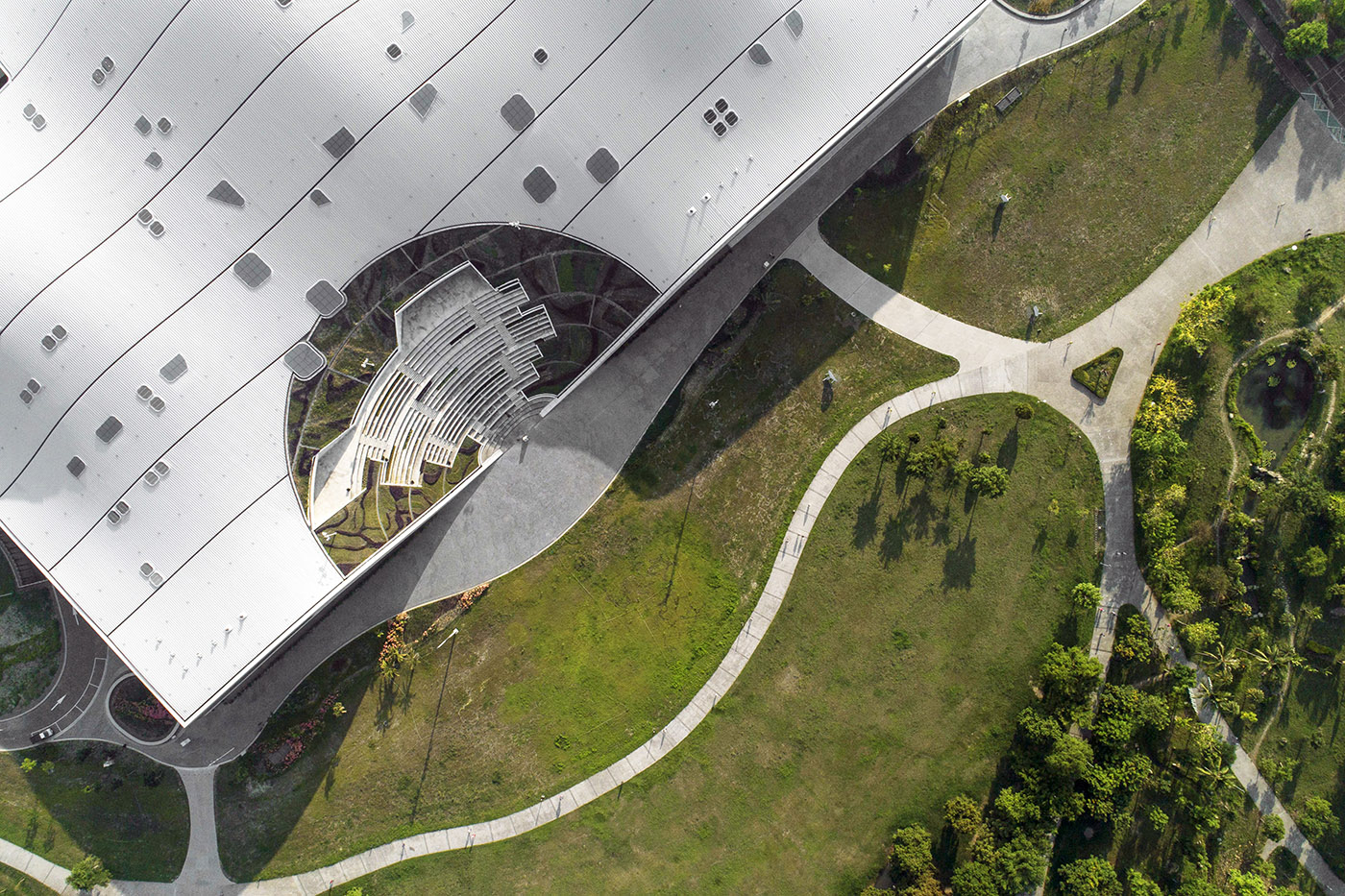 7 hectares de paysage architectural, équilibré entre des volumes doux et durs, accueillent des espaces pour des événements et des accès logistiques, créant un gradient de végétation qui se déverse dans le parc Weiwuying. L'œuvre architecturale est couronnée par une vaste couverture ondulée composée d'une structure en acier courbé et d'un tissu technique en forme de plaque tectonique qui constitue la base conceptuelle du projet. Ce toit ondulé est une merveille de l'ingénierie structurelle, avec un côté excavé pour former l'amphithéâtre en plein air offrant un impact scénique et paysager élevé