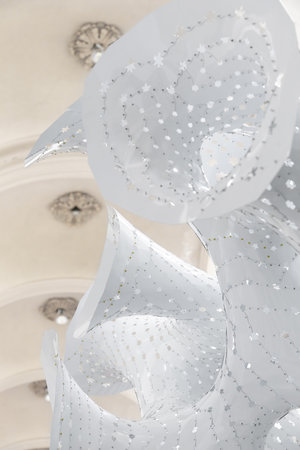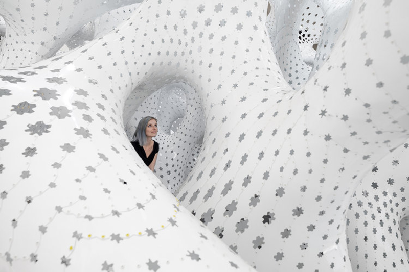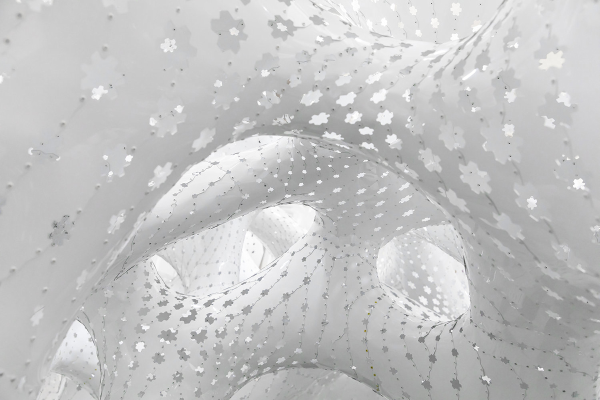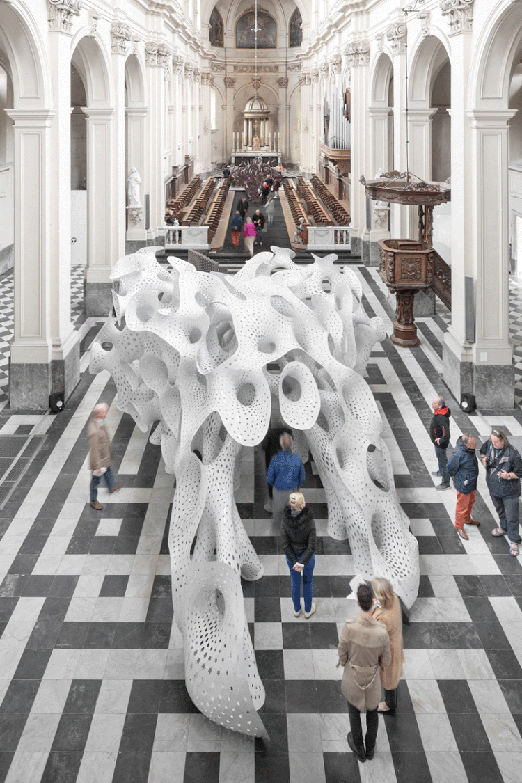 The openings between the connecting parts filter the light, alternately projecting the shadow and the streaked light into the interior. It is more of an experience to walk along it, you have the sense of floating through a structure similar to a coral. Tentacular and enveloping forms within the spatial environment are joined by a continuous surface of polished white aluminium, made up of 6,367 non-linear strips