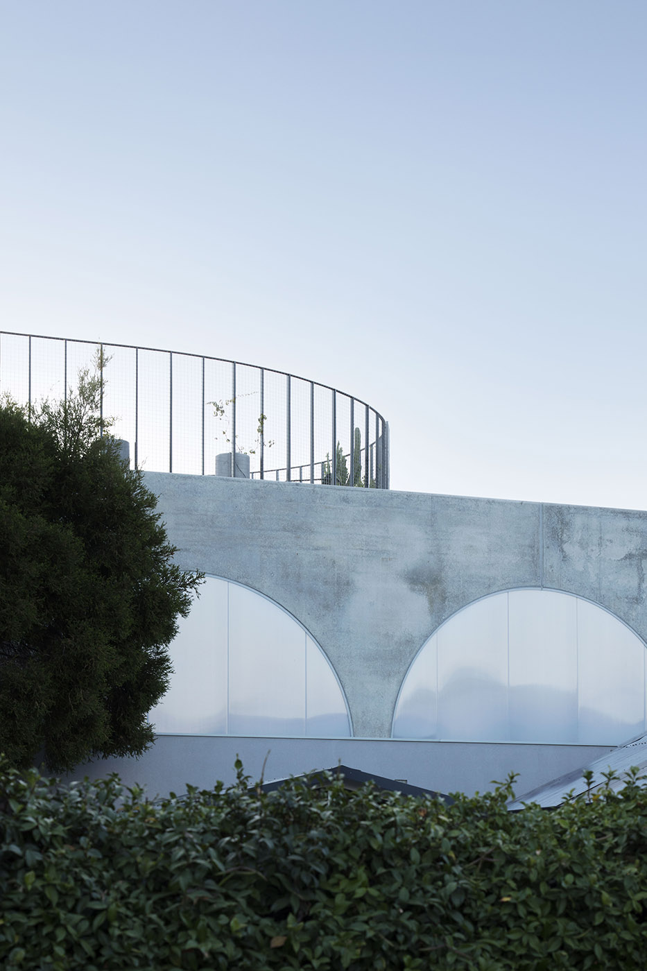 The use of materials is deliberately limited: rough concrete for the heavy, laborious elements, wood for intimate moments and a translucent material to counteract the entry of the sun to the east and west and make the light soft and pleasant in the interior spaces