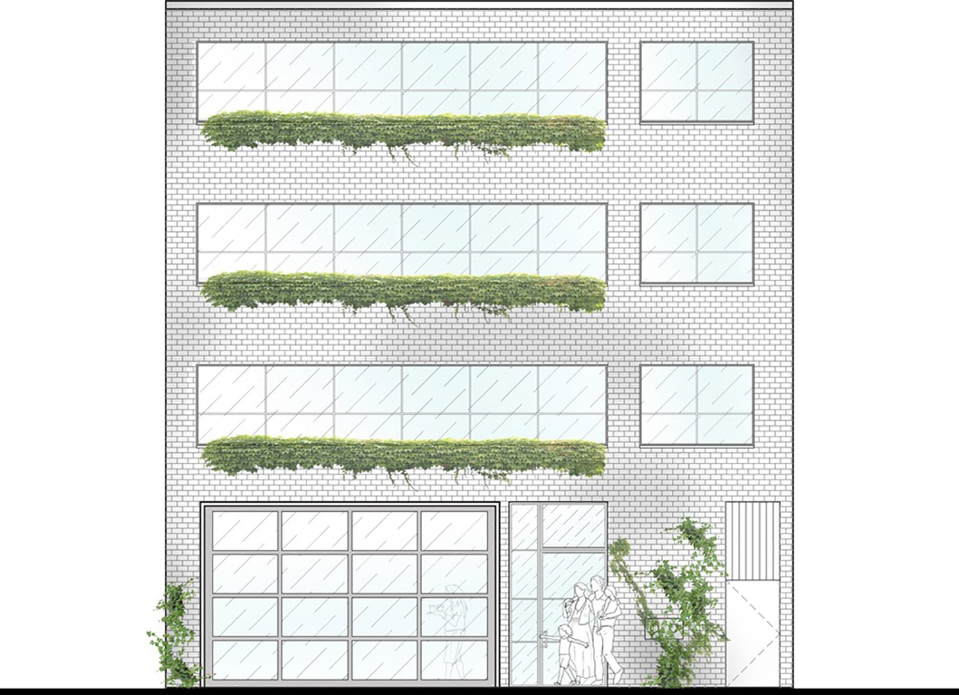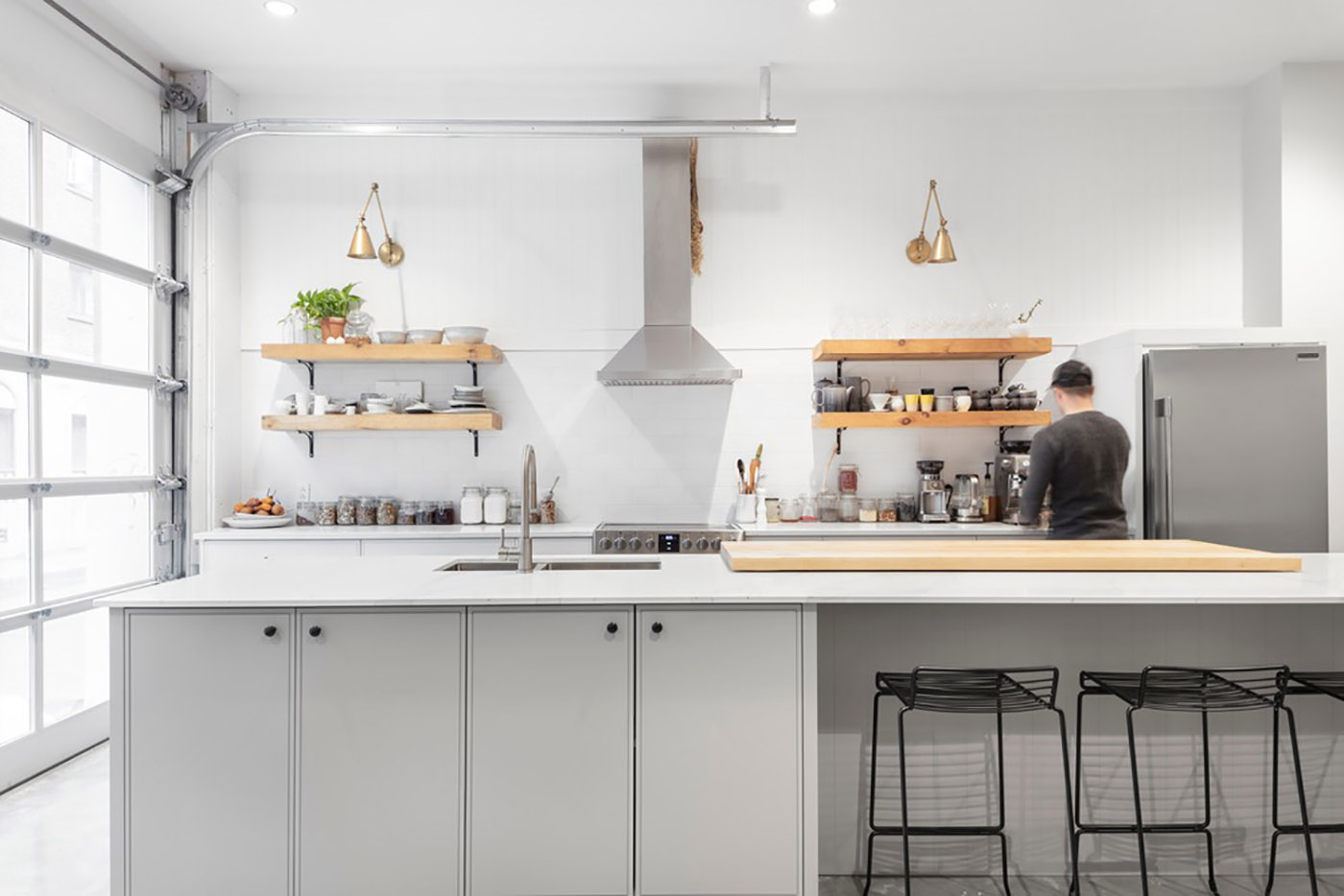 The street façade opens outward and lets in the daylight from the large glazed garage door, preserved as an architectural element to recall the old function. It, among other things, allows the space to be fully opened in the summer season to enjoy natural ventilation. This structural feature is also a gesture of openness to the neighborhood, providing an opportunity to offer inclusive creative activities reinforcing the family spirit of the place and openness to the community