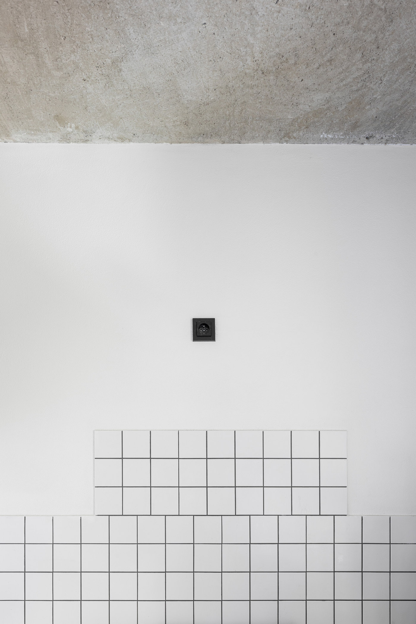 The entrance and kitchen were joined by tiles, which also run up the wall and are broken off above the stove, creating a kind of cooking altar. Glass-cement blocks illuminate the bathroom with turquoise grout. Original wood floors in the rooms have been restored, original doors removed, and openings in the concrete walls retained. The load-bearing walls and ceilings were brought to live concrete as much as possible. Finally, new tin doors allow for creative work with magnets and complement the avant-garde character of the corridor in contrast to the intimacy of the rooms