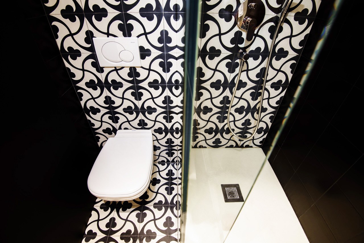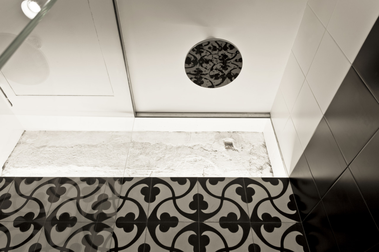 A door, which also functions as a blackboard and a curtain creates an ambivalent relationship between the kitchen and the bathroom, with the sink between the two. The black tiles in the bathroom enhance the shadows and their clean lines contrast with the imperfections of the 19th century exposed brick walls