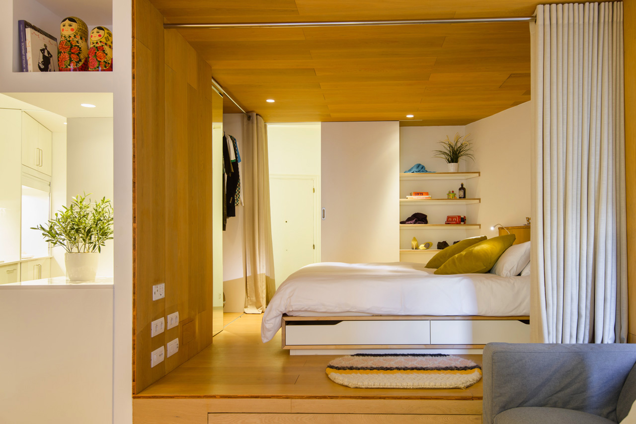 The strategy of the intervention is to connect a space for personal and social use within a double layer. A nest of tranquillity positioned in the centre of the space, acting as a diagonal channel, allowing light to penetrate deeply into the living and working areas, continuing on to the kitchen and finally the bathroom