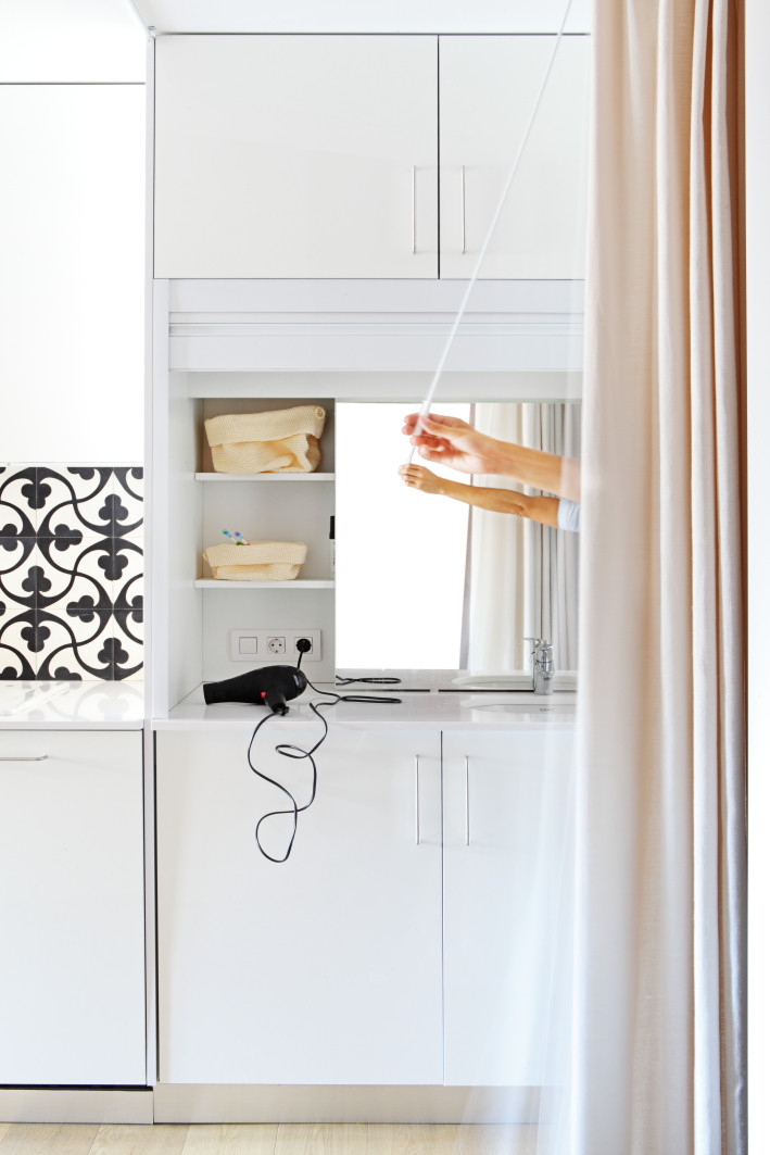 Miel Arquitectos and P10 deconstruct the rigid barriers of the late 19th century design. The northern front of the apartment has been designed to convey the light reflected from the buildings in front of it and from the courtyard. The main objective is to use the 48 m2 space to create individual areas that create a flexible response to residential needs, such as work, rest, recreation, industry and hygiene