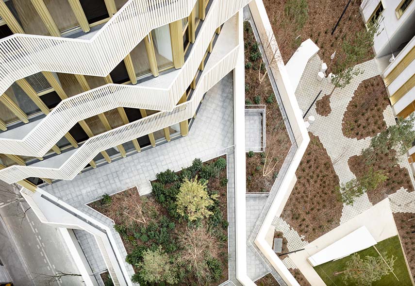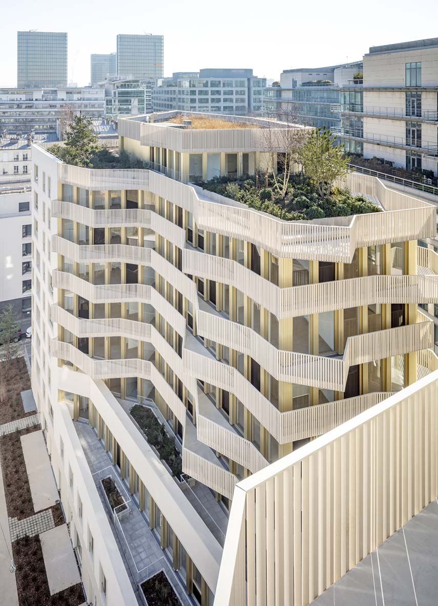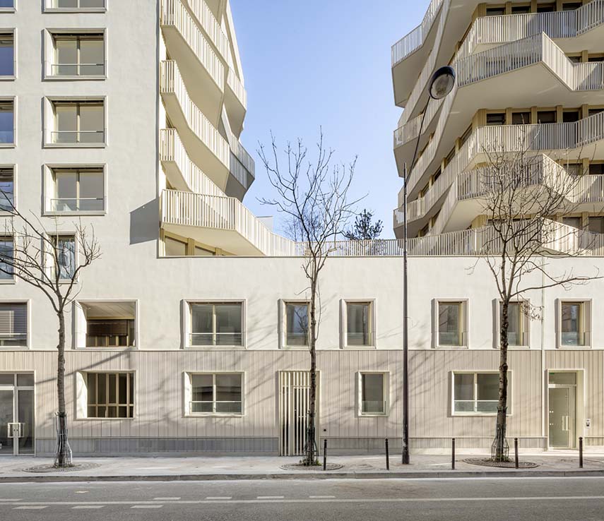 La grandeur du projet, réalisé par Anne-Françoise Jumeau Architectes, est évidente dans sa configuration architecturale. Conformément aux normes géométriques et urbanistiques, le bâtiment s'étend sur plusieurs niveaux, offrant une variété de solutions de logement. La base accueille des activités commerciales et des logements en duplex, tandis que deux tours émergent avec élégance, abritant des logements intermédiaires et sociaux.