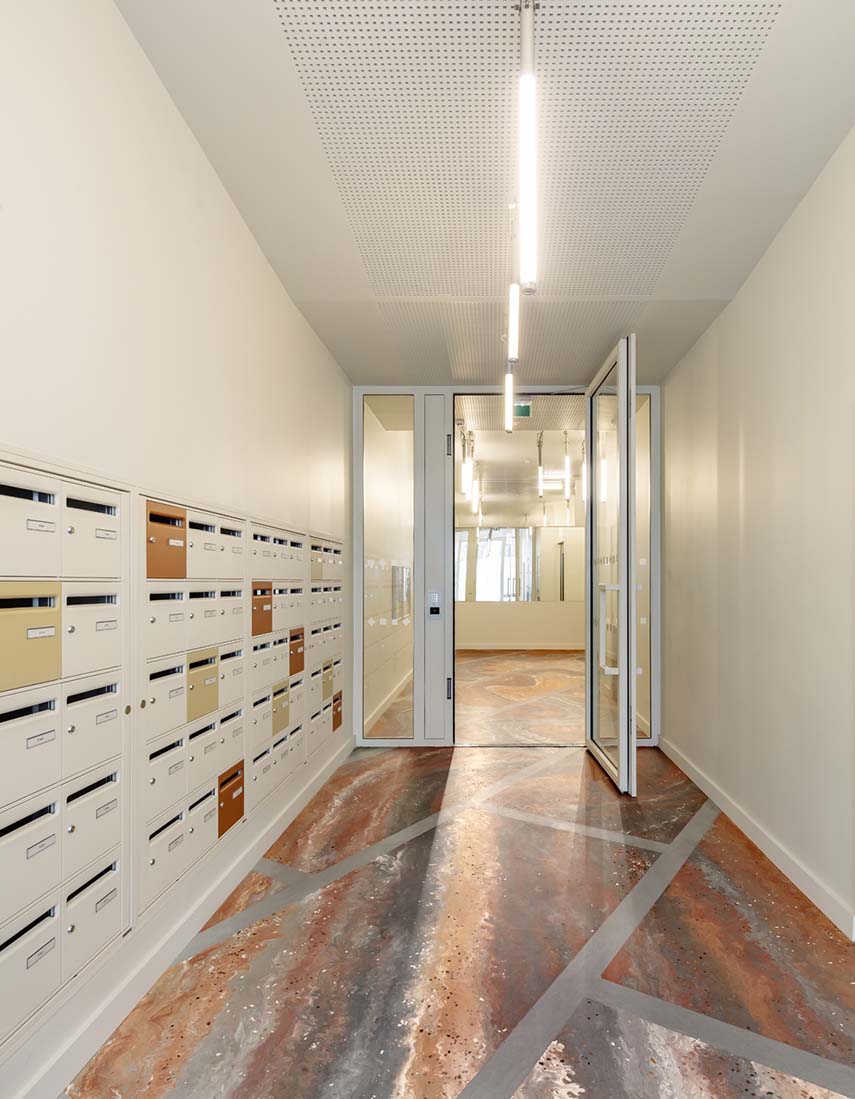 Parmi les caractéristiques distinctives du projet, on trouve le Marbre de Fulton, une œuvre d'art qui rend hommage à l'histoire et à l'identité du quartier. Réalisé avec des matériaux recyclés provenant de la démolition des bâtiments précédents, ce marbre horizontal s'intègre dans les halls des bâtiments, racontant la mémoire du lieu et célébrant son passé et son présent avec une élégance intemporelle.