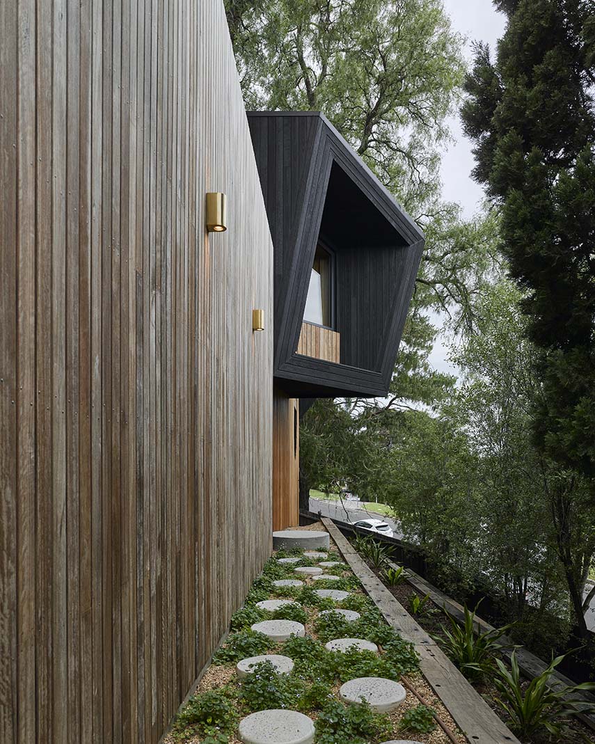 La maison préexistante avait une façade en briques vieilles et thermiquement inefficace, tandis que l'agencement intérieur convenait parfaitement à la jeune famille de propriétaires. Le projet de l'architecte Alexander Symes consiste donc à mettre à jour l’enveloppe de la première habitation (nouvelle isolation où possible, une façade ventilée en bois, de nouveaux puits de lumière, une pergola enveloppante de panneaux solaires) et à créer une séduisante résidence secondaire construite autour de l'arbre à poivre de presque 60 ans dans la cour arrière