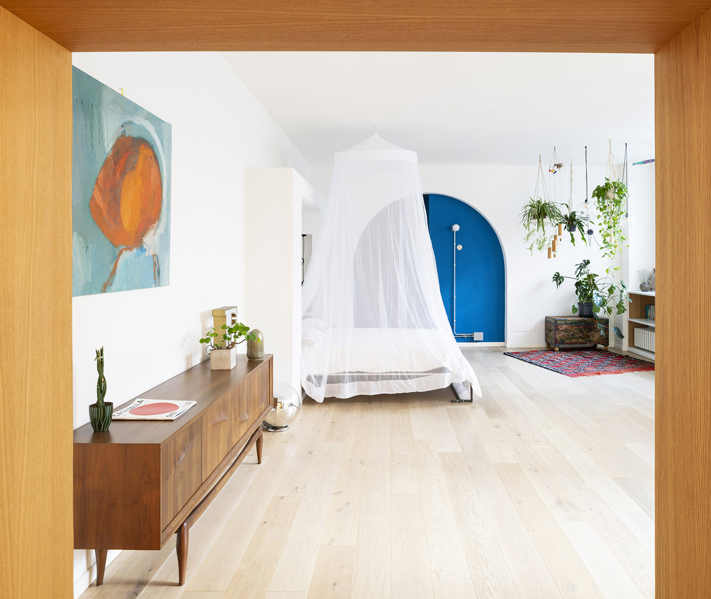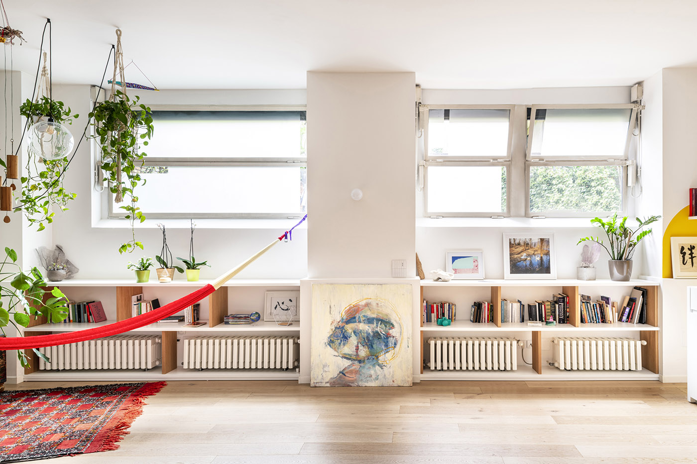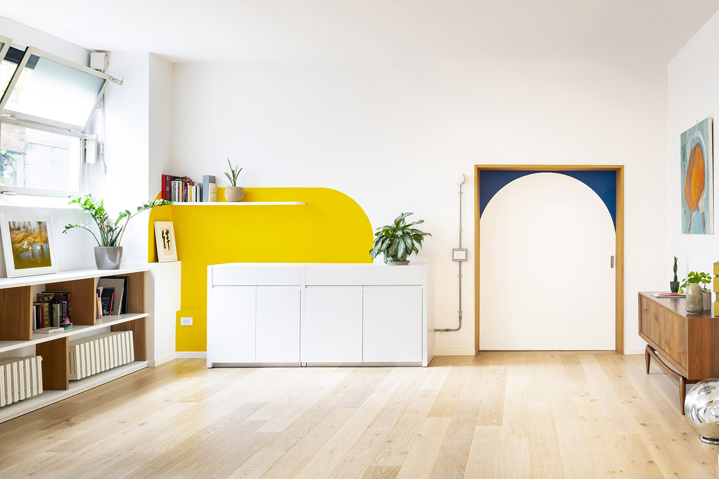 Couleurs vives, arcs, meubles sur mesure avec des pièces vintage intercalées, bois, vert (beaucoup) et un petit coin d'inspiration mexicaine avec un hamac sud-américain original fait à la main. Ce sont les ingrédients du projet de design d'intérieur Mexique et Nuages, né dans le grand sous-sol d'un immeuble des années 70 au centre de Milan.