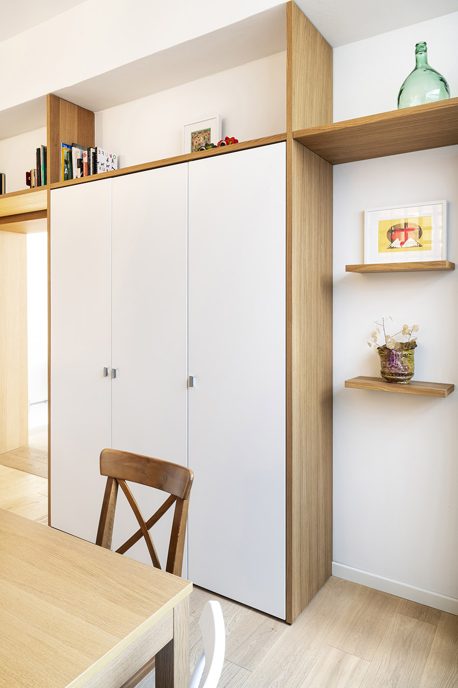 Merci aux artisans talentueux qui m'ont patiemment permis de construire des meubles sur mesure, il a été possible de cacher une petite cuisine, des lits et des armoires dans des espaces inimaginables. Ainsi naît un espace dynamique, plein d'énergie, qui reflète également la personnalité du propriétaire.