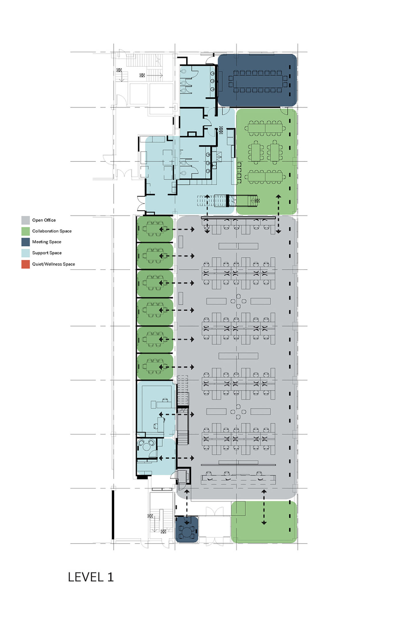 To complement the open and transparent layout, the design offers options to accommodate different work modes using a mix of desk locations and densities, as well as private areas for small teams or individuals to retreat and focus when needed. The mezzanine workspaces overlook the main level in order to accommodate staff who want quieter, but still connected spaces