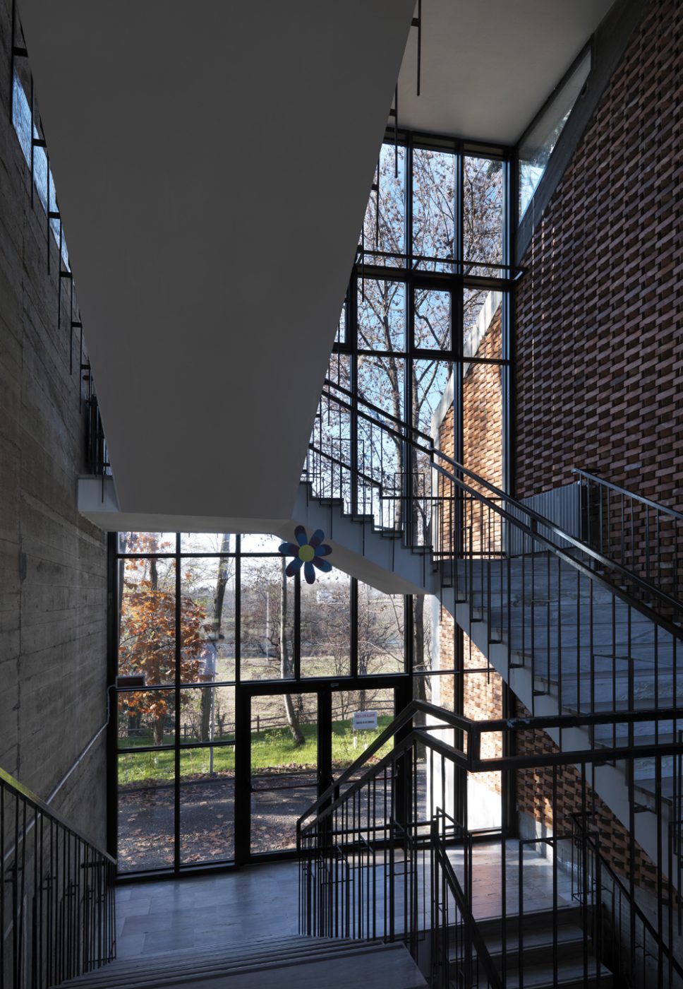 Inspired by the styles of post-war Scandinavian architecture, the simple and light forms of the school are distinguished by the extreme transparency of the façades, characterized by large windows that flood the rooms with natural light and promote the perception of the surrounding green spaces, emphasizing the direct relationship between the interior and exterior