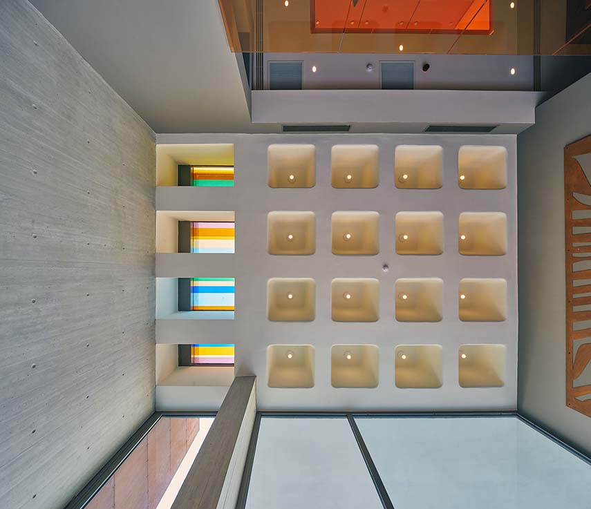 En contraste avec la texture chaude et rugueuse de la partie inférieure, la partie supérieure maintient un sens de pureté et de légèreté avec l'utilisation de textures lisses et de tons blancs. Le luxueux marbre pour les sols et les revêtements muraux, la peinture, les meubles, les sanitaires et les éléments d'éclairage sont tous choisis pour refléter cette vision. Le film de couleur orange qui a été placé sur les garde-corps transparents des galeries attire le regard vers le haut, mettant en valeur la profondeur et la relation visuelle verticale entre les étages et les deux parties composant chaque villa.