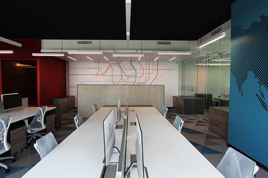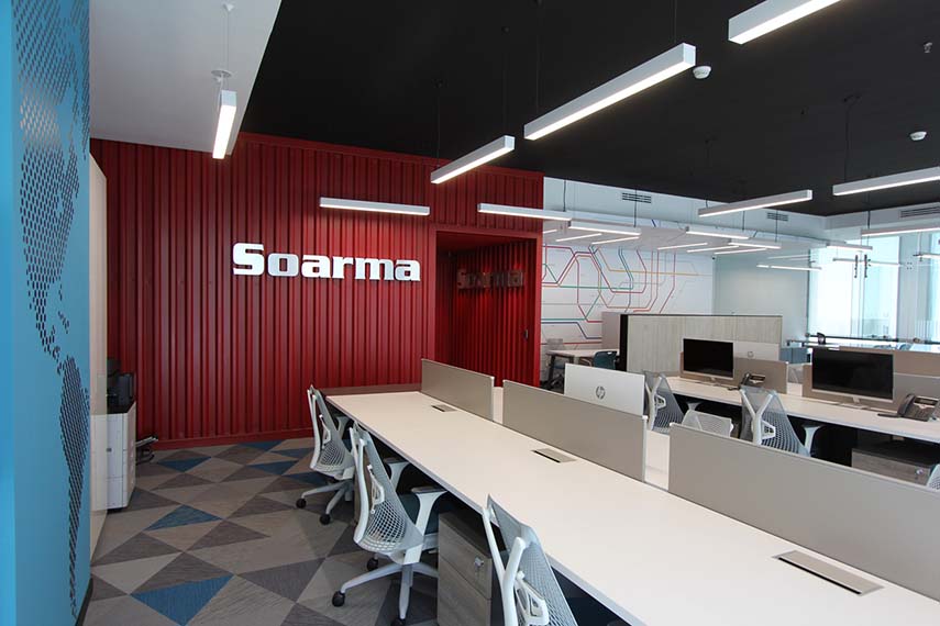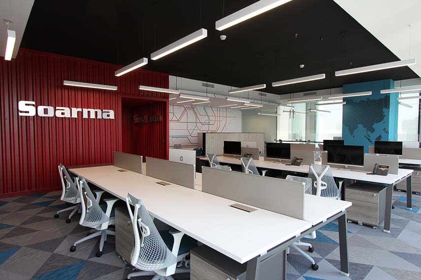 L'équipe d'ARCO Arquitectura Contemporánea a conçu pour Soarma un espace d'entreprise où flexibilité et productivité sont au cœur du projet, dans une atmosphère dynamique et contemporaine, de style industriel. Le logo de l'entreprise accueille les visiteurs, appliqué sur le conteneur rouge qui sert d'entrée. Ce volume à fort impact et le sol en béton poli sont au centre de tout le concept, rappelant la vocation de l'entreprise dédiée à l'importation et à la commercialisation de quincaillerie