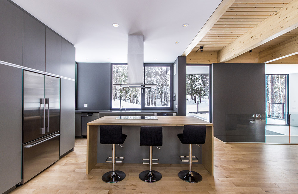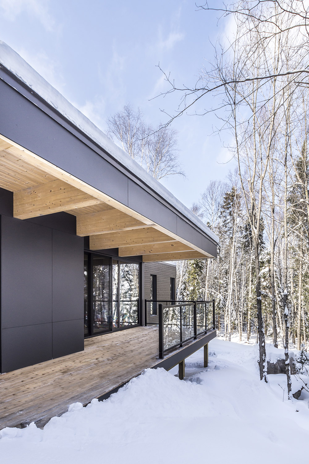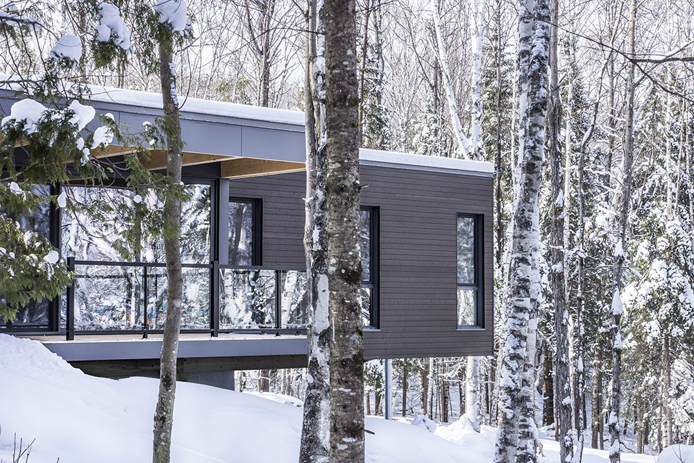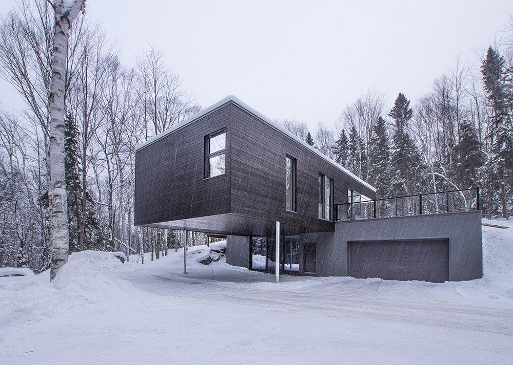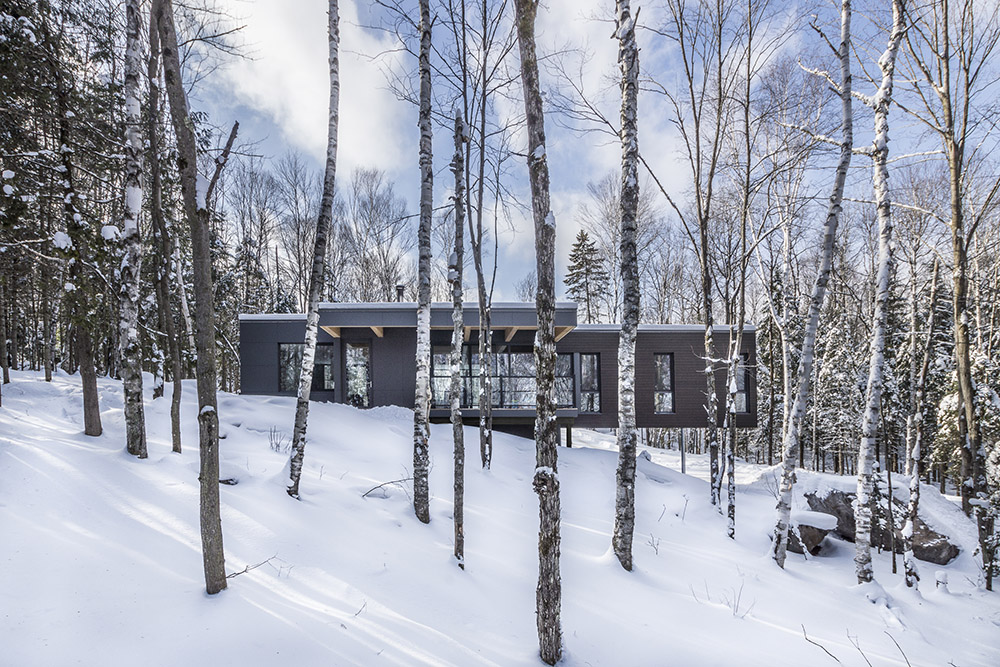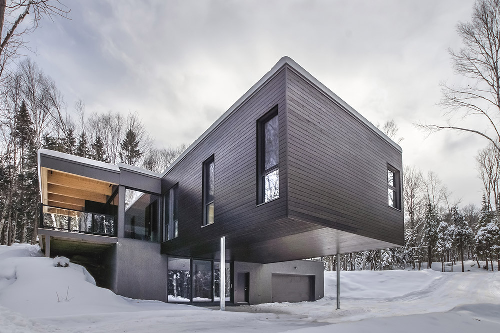Le Refuge des Hauters, situé dans la forêt canadienne de Mont-Tremblant, est le projet du studio Natalie Dionne architecture, avec une complexité structurelle notable, se présentant sous la forme d'un volume de bois sombre qui s'étend dans le vide sur une longueur de neuf mètres