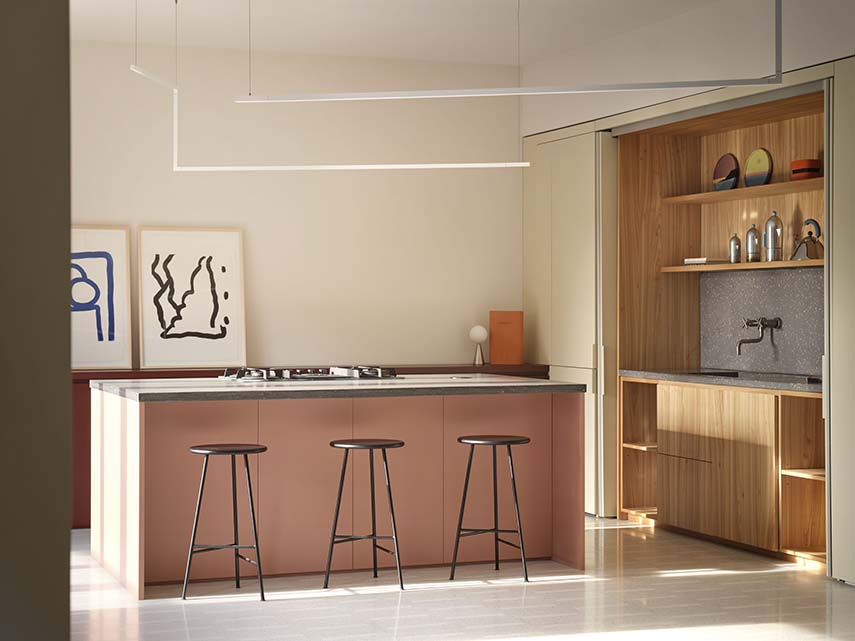 L'espace généreux dédié aux activités conviviales est illuminé par trois fenêtres sans rideaux, qui rappellent l'esthétique des villes nordiques. Le point central est une île de cuisson à cinq feux, véritable foyer de la maison, inspirée par les couleurs vives d'un peintre bolonais des années 50. Cet environnement polyvalent conserve délibérément une identité ambiguë : est-ce une cuisine ? Ou une extension du salon ? Les surfaces cachent et révèlent en même temps, prêtes à se transformer en piste de danse pour des occasions spéciales.