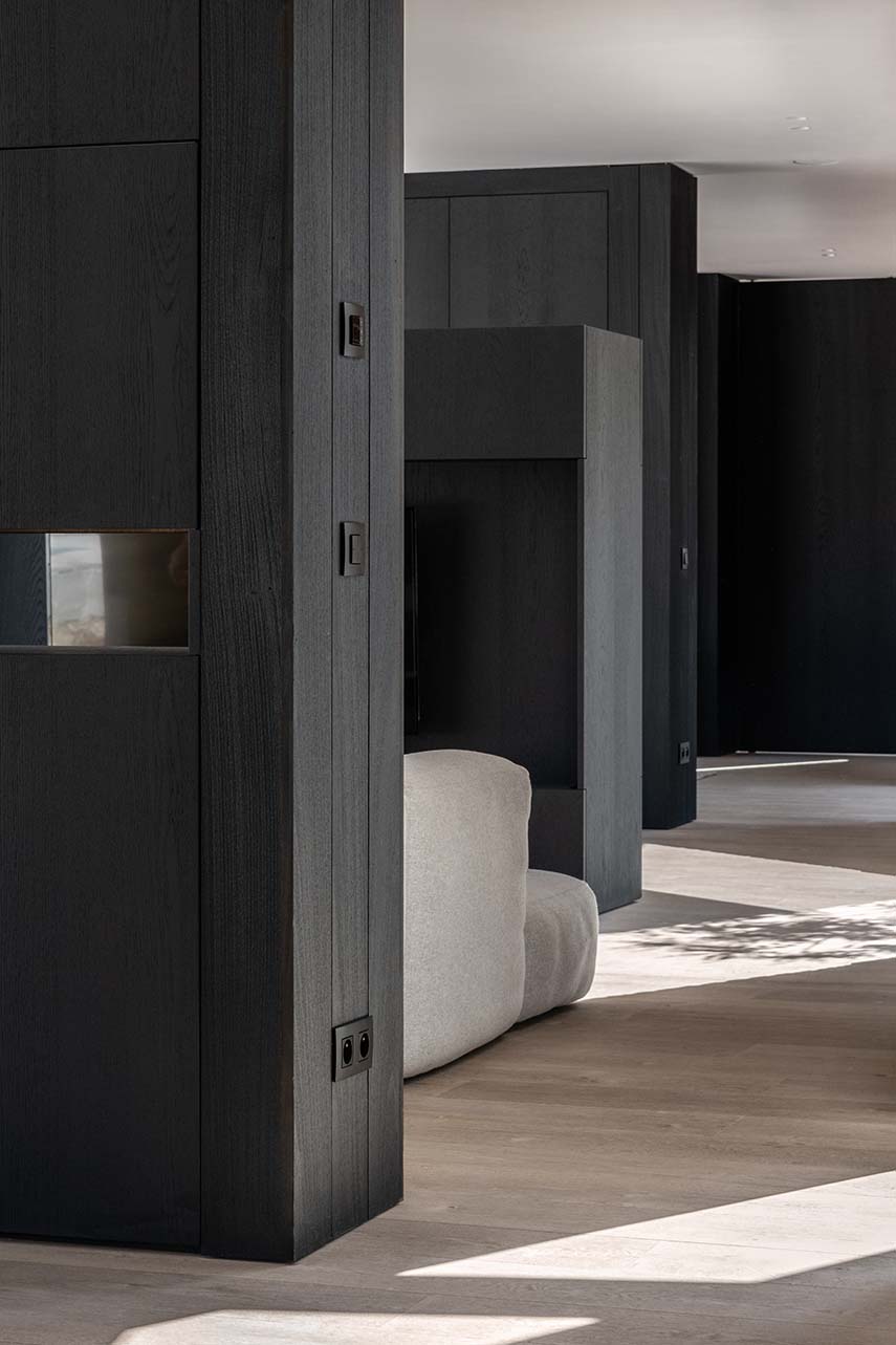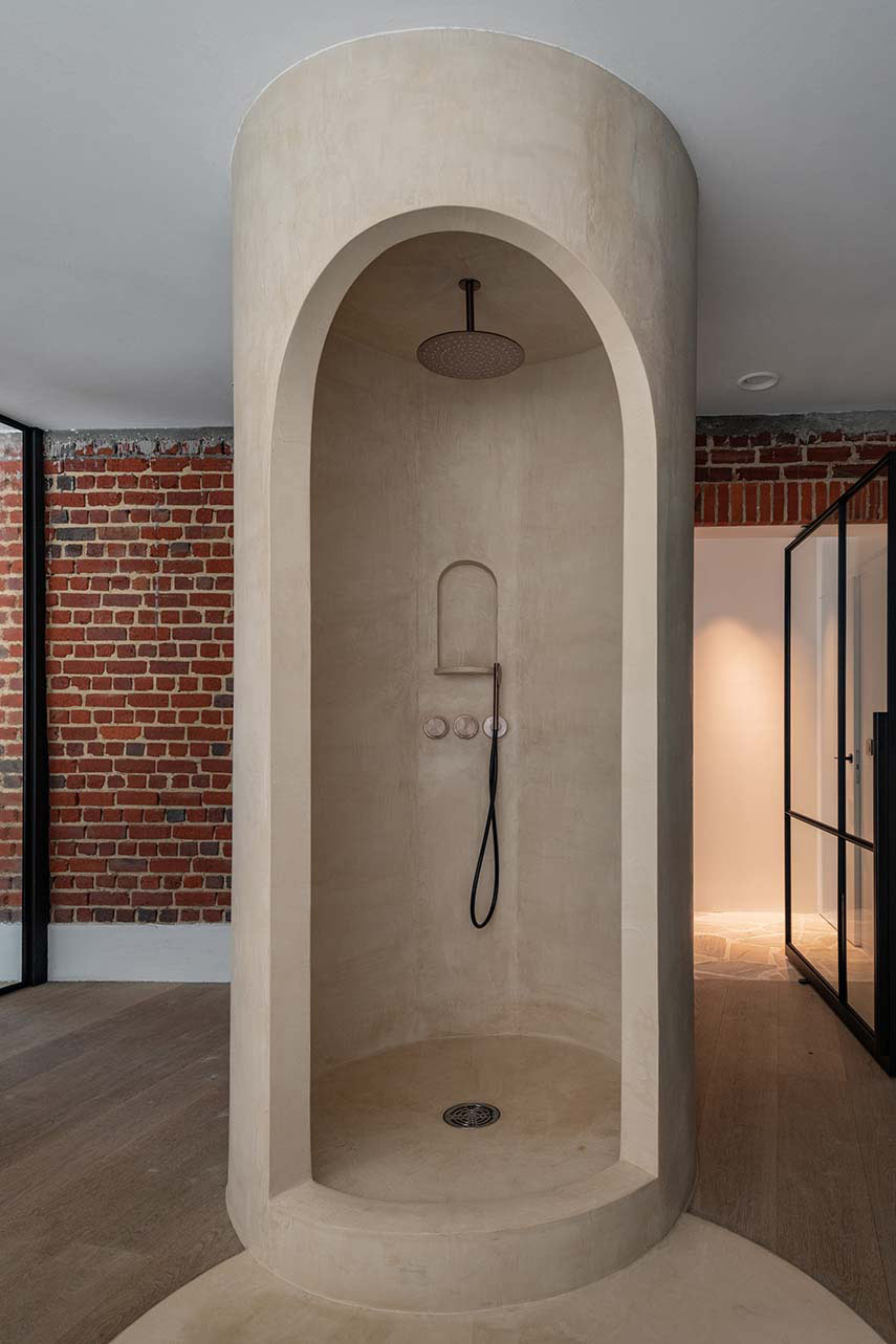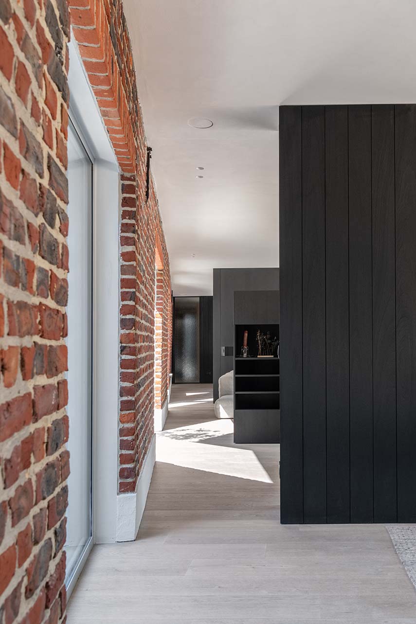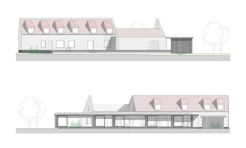 Le cabinet d'architecture belge Objekt Architecten est chargé de la rénovation de la maison Ossel, achevée en 2024. La ferme, située sur un grand terrain, est entièrement rénovée: en conservant les ouvertures d'origine et la cheminée caractéristique, le salon est transformé en un patio. Le nouveau volume, construit contre l'arrière de la ferme, est caractérisé par de grandes baies vitrées et des murs finis en bois foncé à l'intérieur comme à l'extérieur