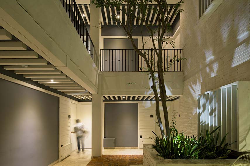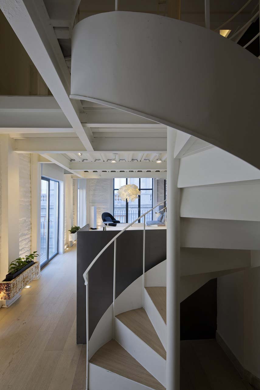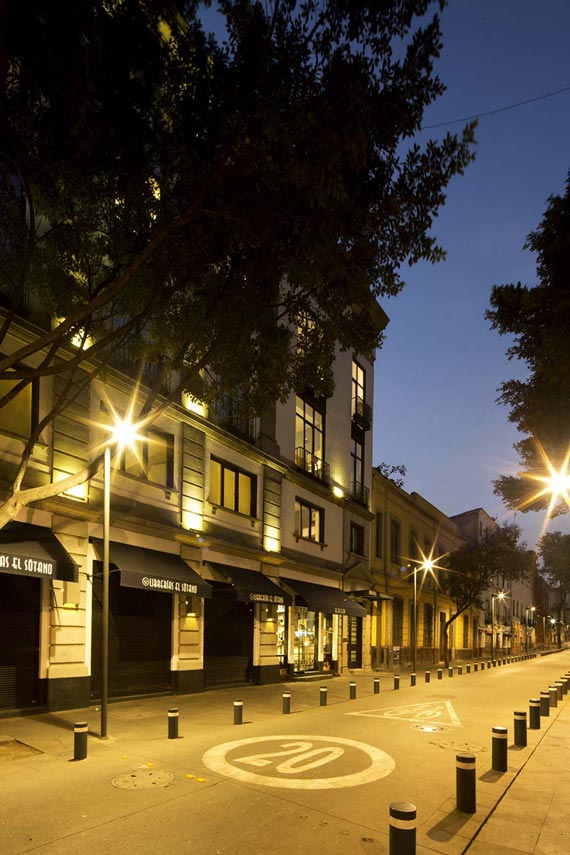 L'équipe de Boué Arquitectos s'occupe du projet de rénovation de la maison historique C57-4 qui implique à la fois les extérieurs, dans un travail de récupération des façades, et les intérieurs dans une réélaboration complète des espaces. Un hall au look sobre et vaguement industriel, caractérisé par l'utilisation de revêtements en bois et de détails en métal noir, mène aux ascenseurs et à l'escalier du noyau de distribution verticale
