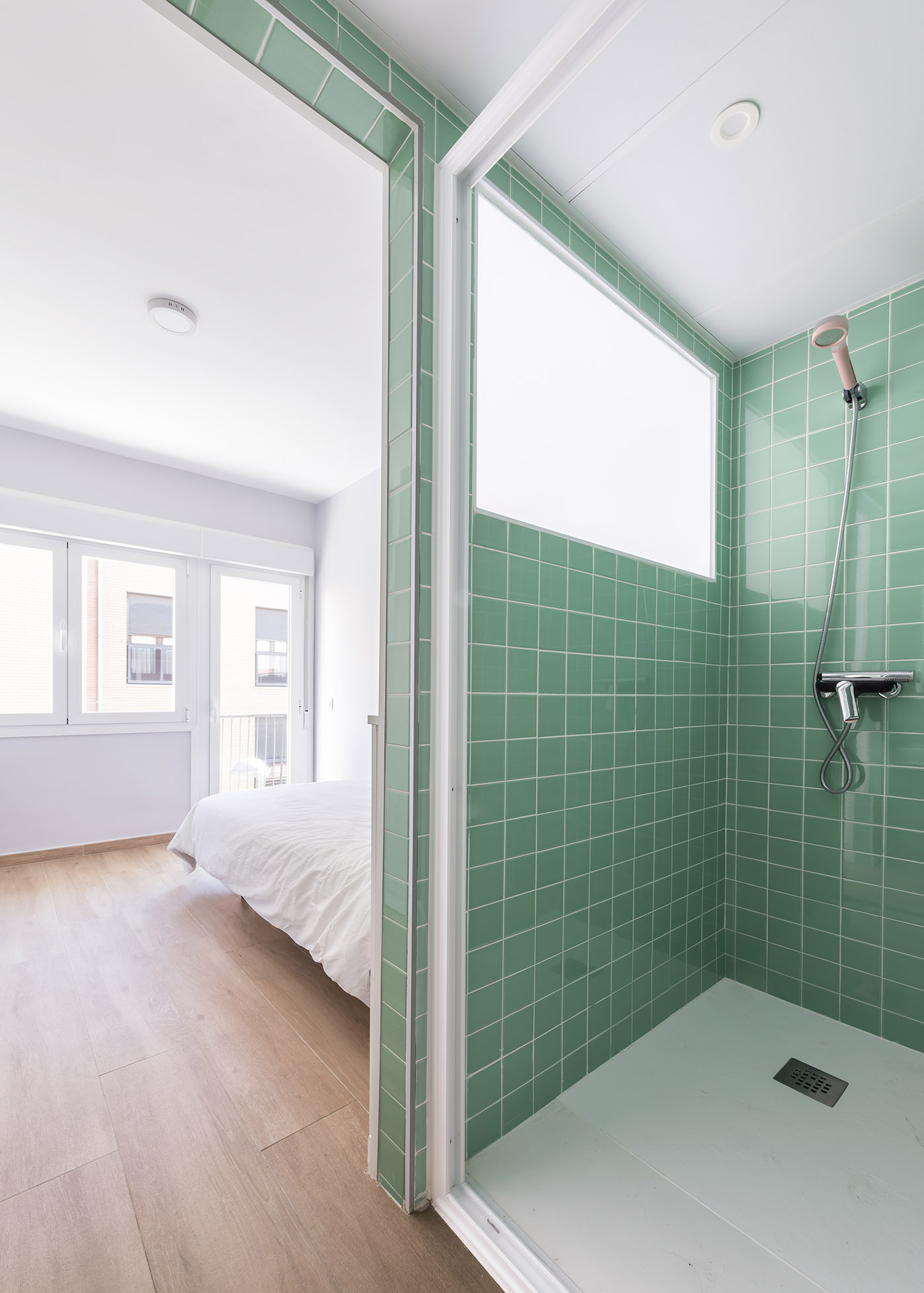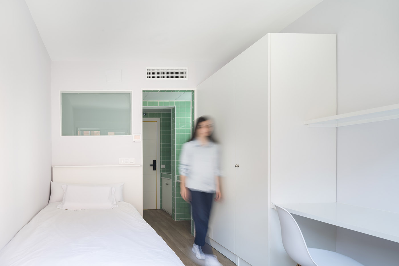 Dans ce cas, le "thème" de la résidence étudiante a permis aux architectes de repenser entièrement l'intérieur du bâtiment, à la recherche de nouveaux espaces communs pour l'interaction sociale, ainsi que l'étude d'une distribution plus efficace afin d'atteindre le plus grand nombre de chambres possible. Pour pouvoir satisfaire la prémisse d'une rénovation complète à faible coût du bâtiment, des matériaux économiques et durables ont été utilisés, sans renoncer à jouer avec des couleurs et finitions audacieuses.