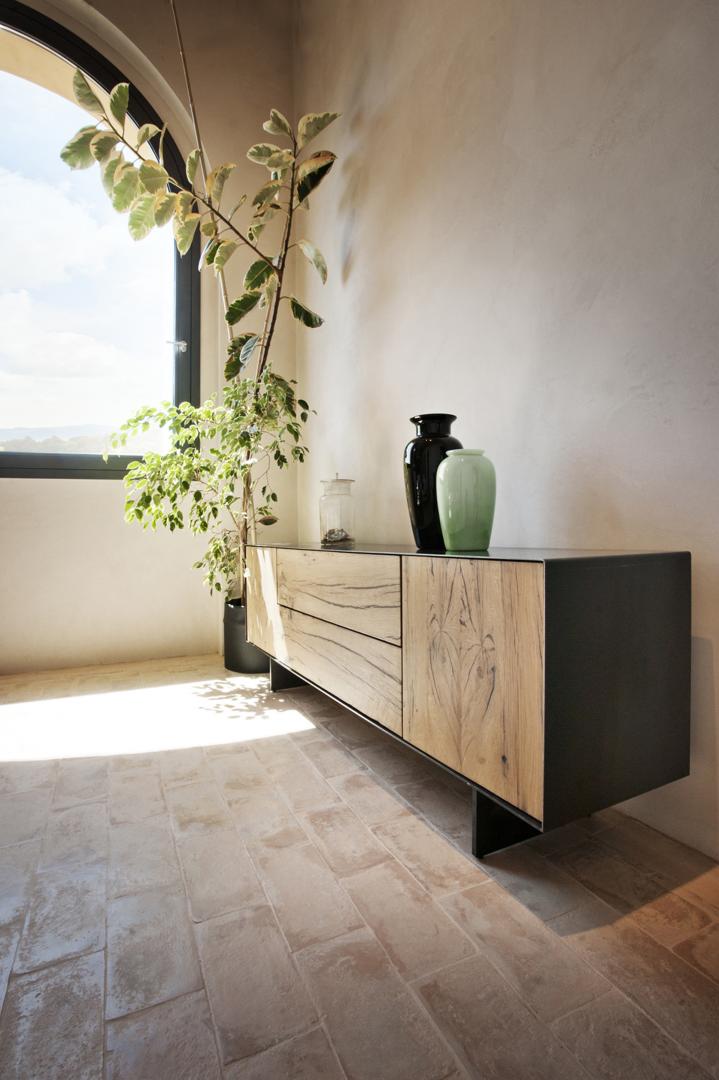 All the furnishings of the house, with the exception of a few recovered objects, have been designed and crafted by local craftsmen. The furniture is made of recycled oak wood with black streaks, raw iron sheet treated with natural wax and matt lacquered wood parts. The kitchen top is made of matt polished black marble