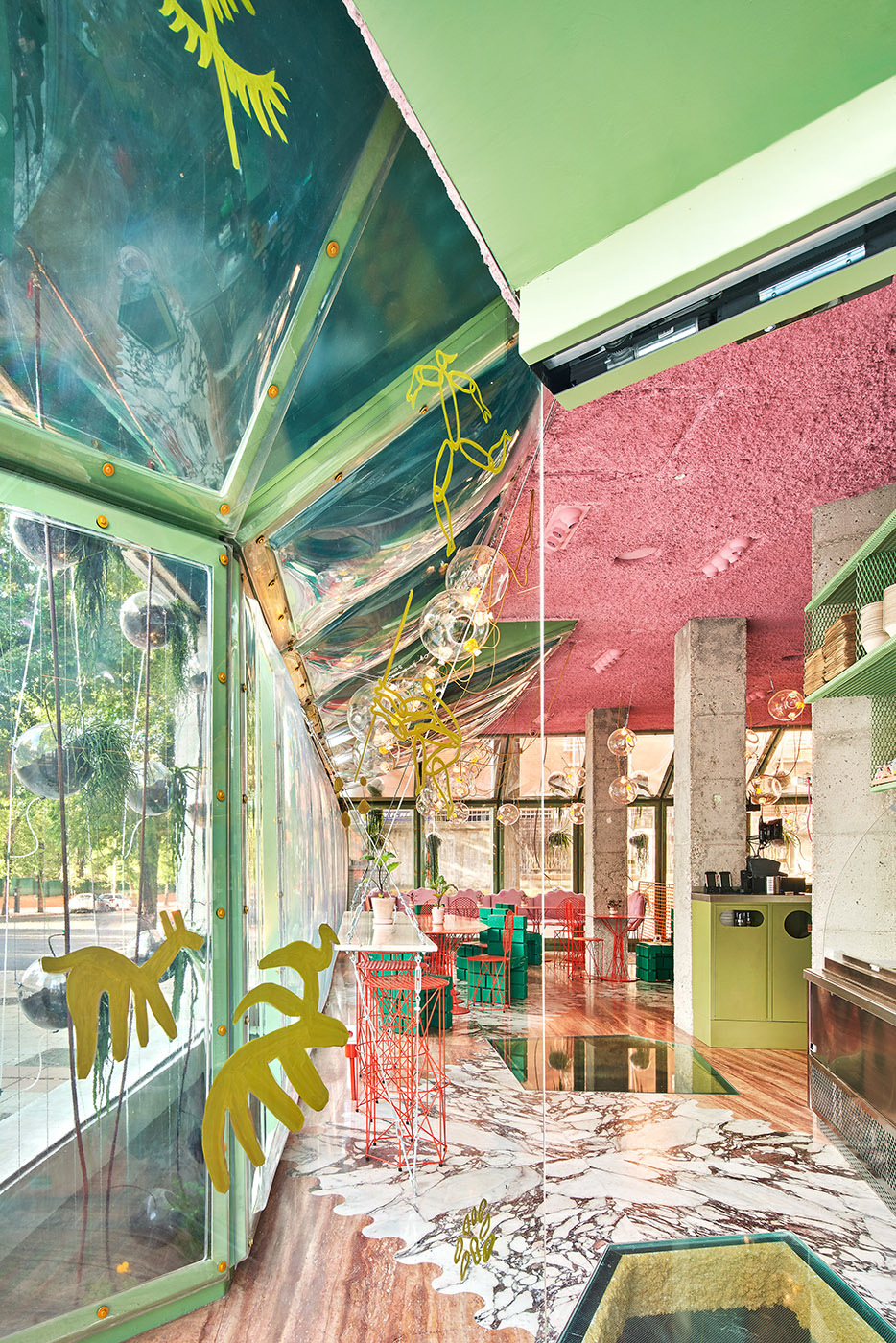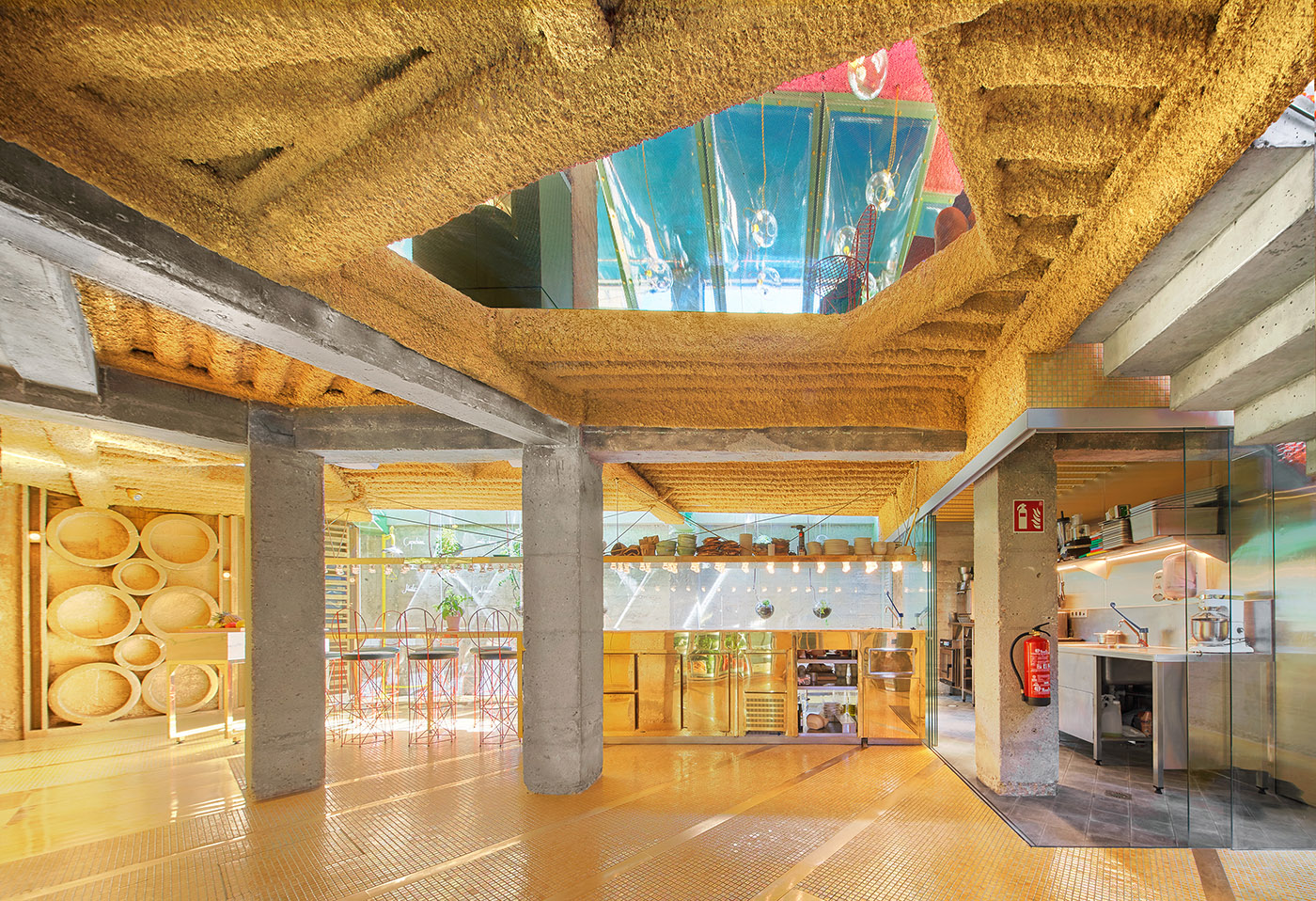 Un des projets de design d'intérieur d'Andrés Jaque est une sorte de ferme urbaine, une grande maison à l'intérieur d'un bâtiment moderne, un mélange entre une grotte et une serre protégeant un jardin suspendu, où sont cultivés les produits qui seront ensuite utilisés dans la cuisine de Run Run Run.