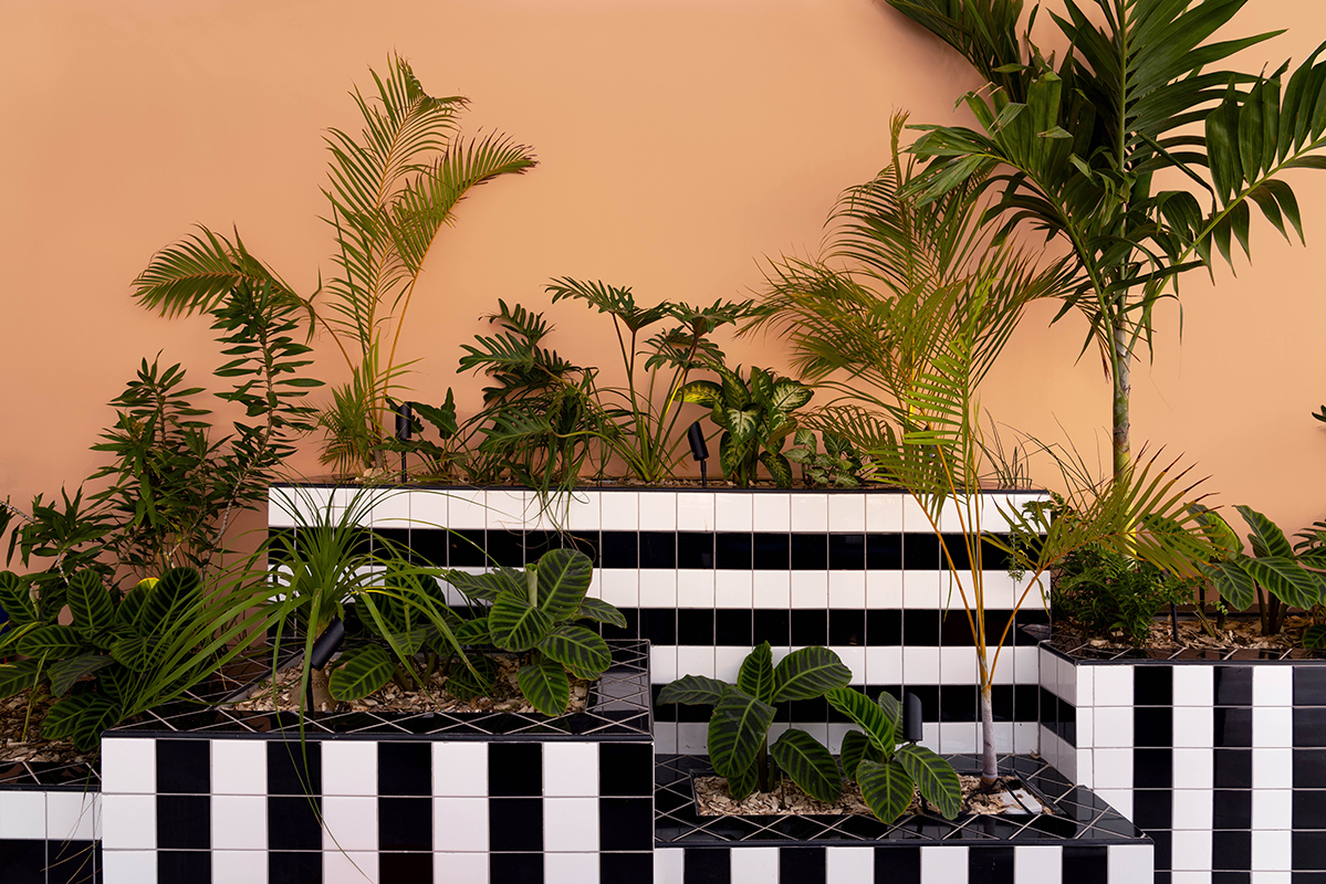 Camille and her longtime collaborator, Julia Jomaa, therefore decided to explore the island to find ideas for the colour palette, looking at both the natural landscape and the man-made environment as a first step in this project. The result balances the natural tones and vibrant Walala pop notes and features a recurring pattern of black and white stripes.