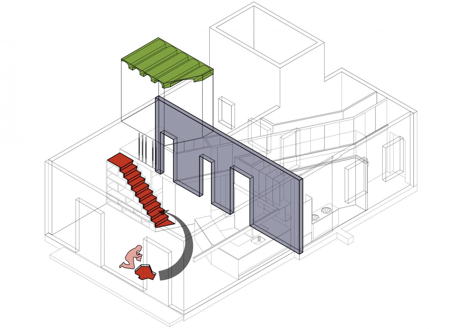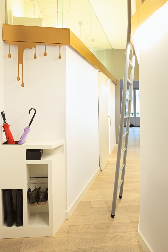 Two gold guides re-trace the bodies that slide on both sides of the diagonals, two technical guides that support the wired, lighting, door guides and a sliding staircase. These golden lines establish a horizontal division in the plain: up to 2.20 m slides through the living space and, above all from the given chariots of space, with another staircase organizes storage lofts, bottle racks, the entrance of the zenithal light in the bath or a multipurpose room