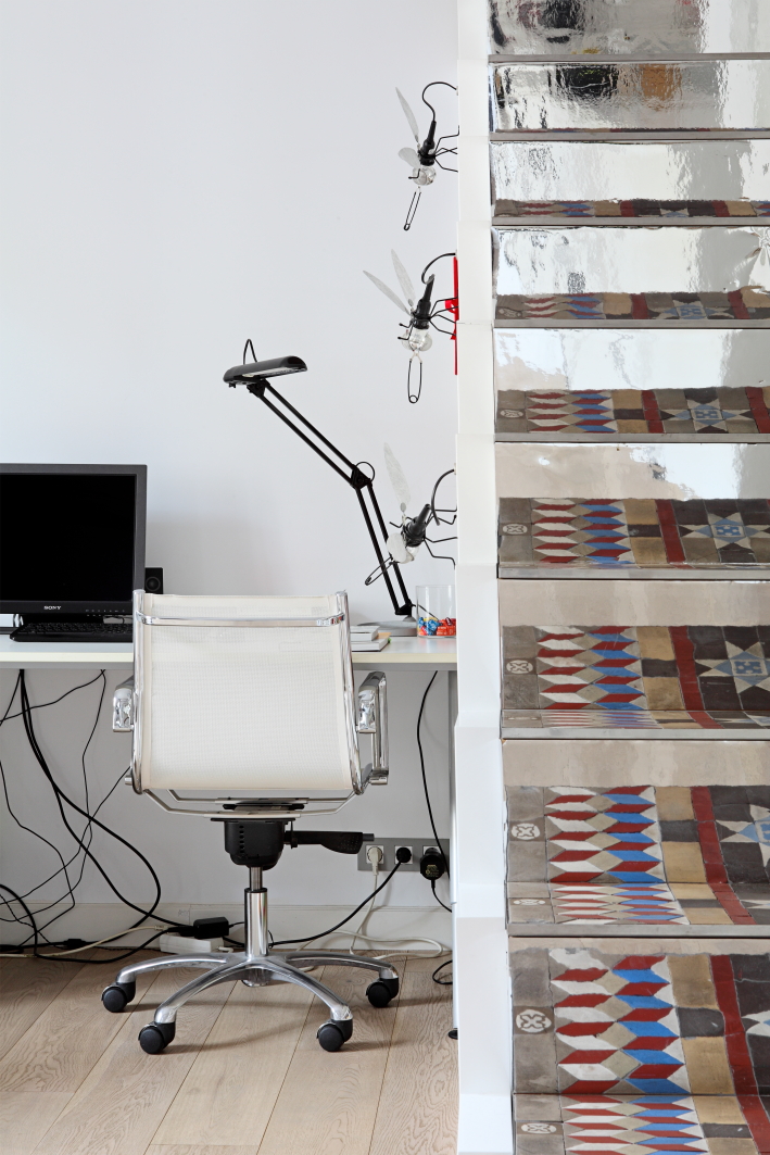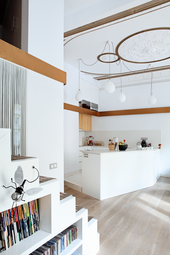 The apartment develops a fresh interaction with its origins that can be discovered between the gold ceiling art craft of the dining room and the dance of illuminated water drops in the tactile experience of the wooden beams that support the floor within reach of your hands in the mezzanines or staircases - furnishings that the wealth formed for the mosaic re-consisted of the old life, which multiplies with reflection like a magic carpet.