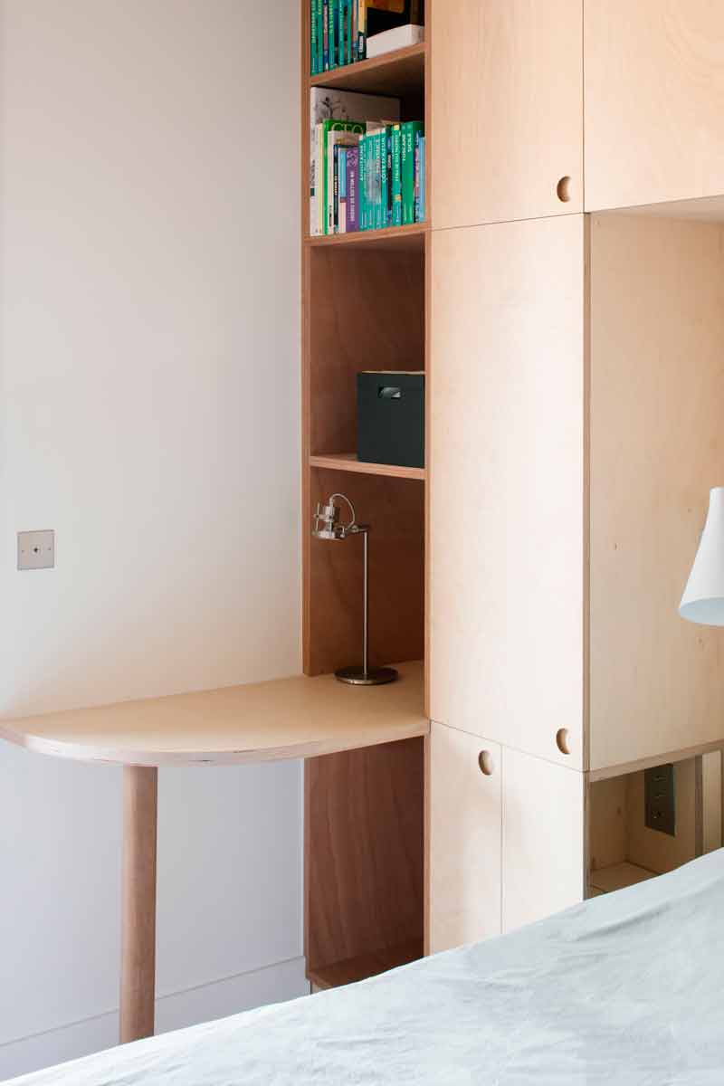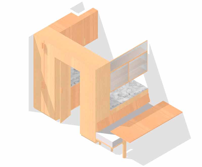 Le troisième volume est constitué de l'armoire, conçue et fabriquée sur mesure. L'armoire est située dans la chambre à coucher, et en plus d'être une armoire classique, elle combine espace de rangement, bureau et tables de chevet enveloppées autour du lit, exploitant au maximum les espaces disponibles autour du lit.