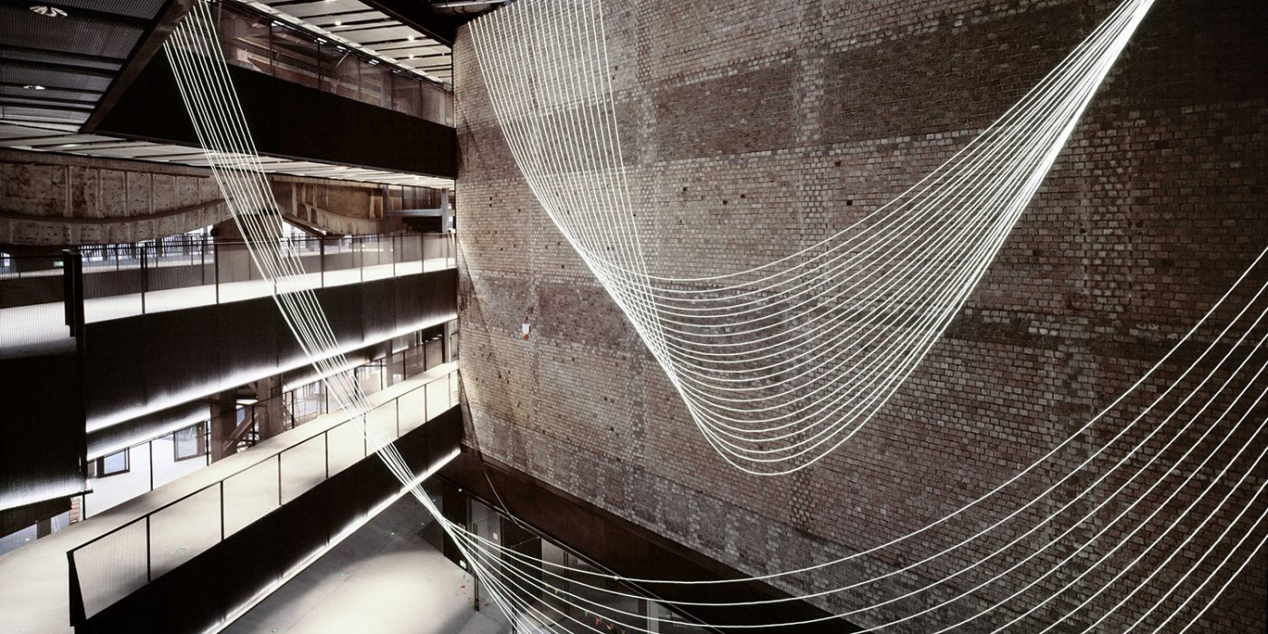 The existing brick wall on the north façade has been renovated, while for the west façade overlooking the street, architect Kuma designed a large brick wall consisting of four different shades of red clay that connects the north and south of the building. The structure, suspended by 8mm thick stainless steel cables, progressively blurs with an interplay of nuances towards the transparent south-facing façade