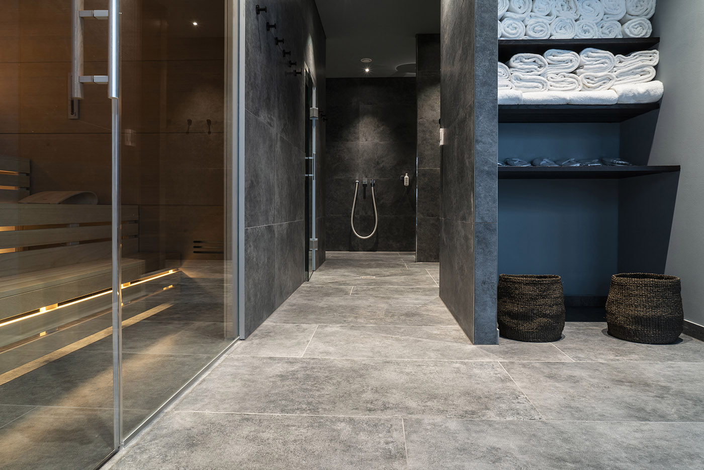 Hard Leather, on the other hand, is used in the Moss Natural variant (120x60 cm size) for the bathrooms of the suites, and in Slate Natural (120x60, 60x60 and 30x30 cm) for the spa, which also includes mosaics. Hard Leather is a charming collection inspired by natural leather, ideal for environments with a bold character and strong visual impact, where the delicacy of the color shades fosters sensory harmony and balance, an aspect always sought after in settings dedicated to wellness