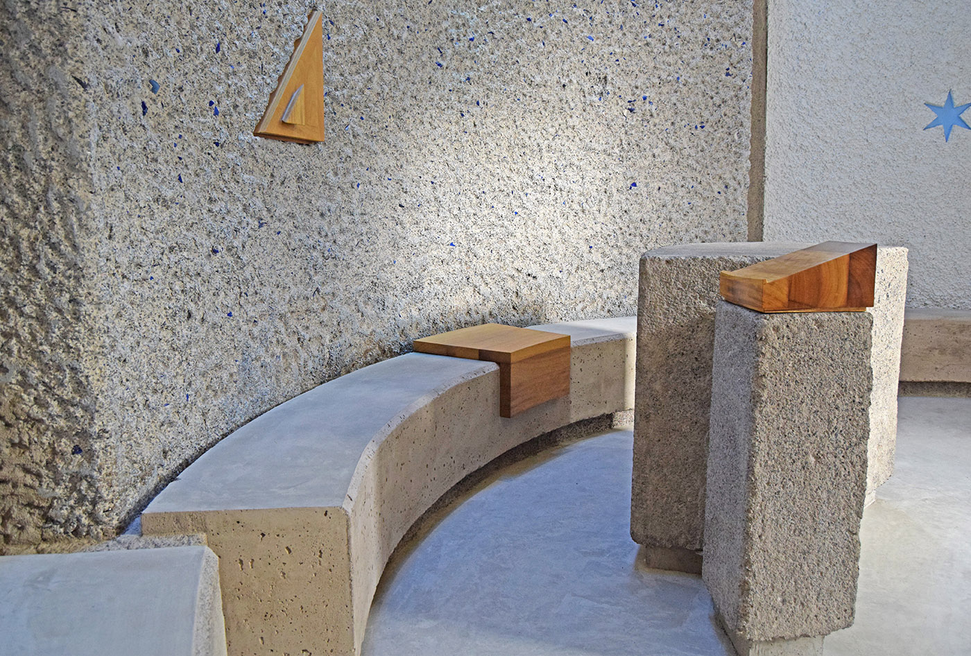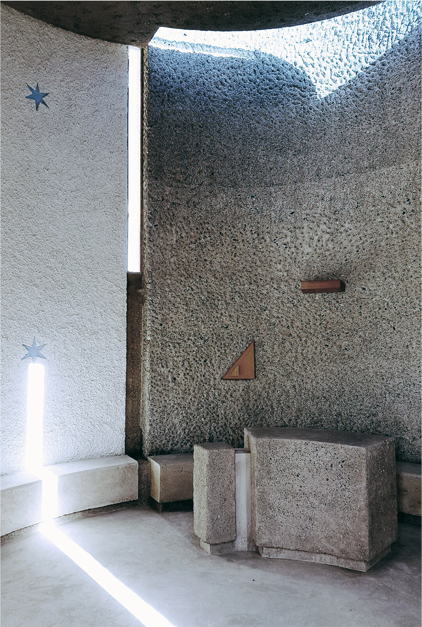 The chapel is designed as a single cylindrical volume, cut diagonally at its top. In this way, the interior space rises in height as one approaches the altar. Adjacent to the chapel is designed a small space for fishermen's prayer that resembles a cave, and a sacristy. The arrangement of volumes forms an open-air patio enclosed between buildings, protected from strong winds