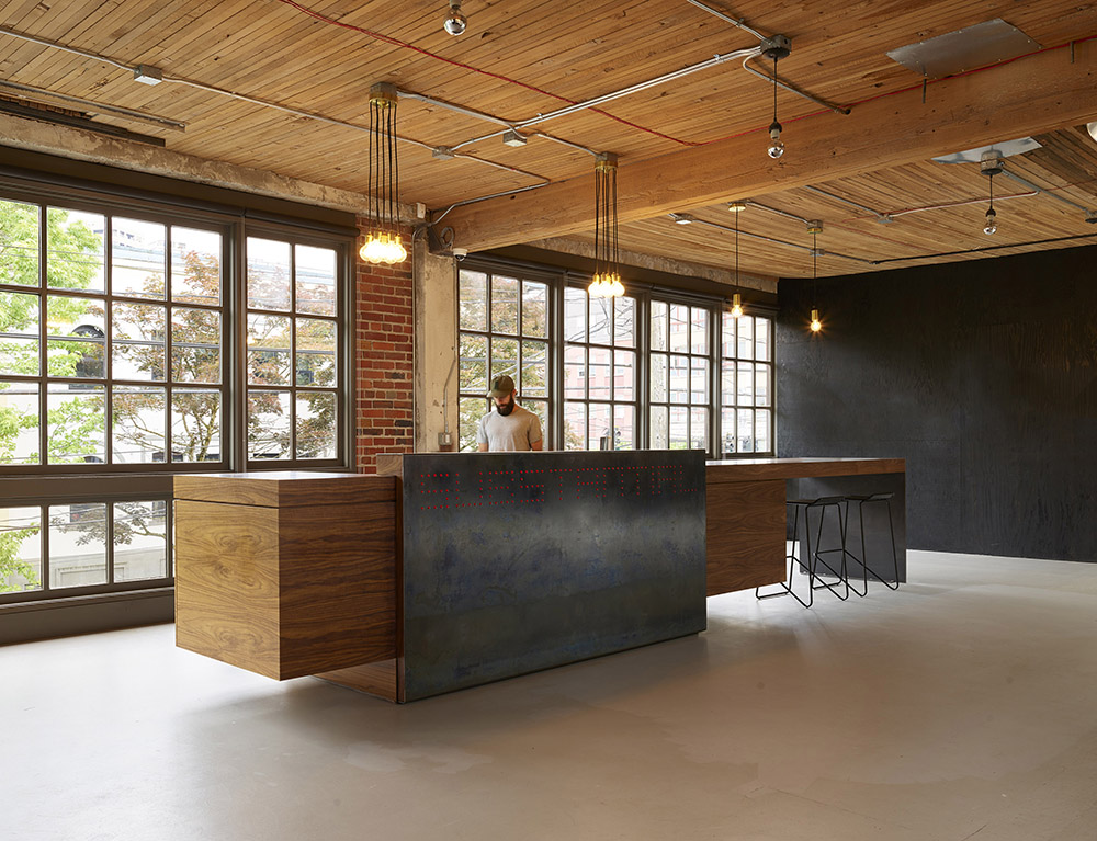 The challenge of the project was to create an open-plan workspace that retained the feeling of the original space and maximized the existing character of the building. Exposed brick walls and fir beams were used to achieve this