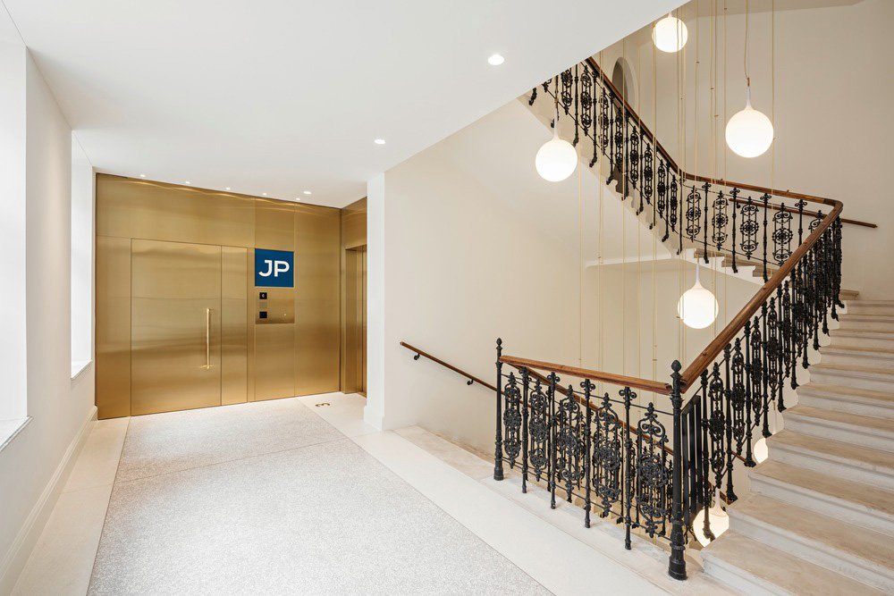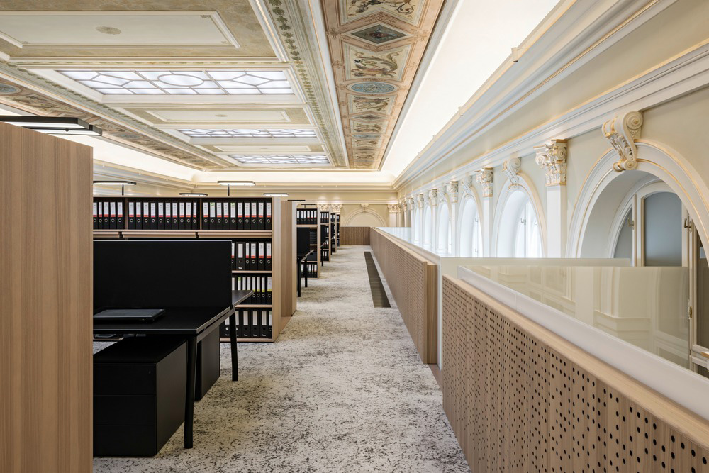 Historical and minimalist elements are combined: a linear design is achieved with the doors, lifts and office units, in contrast to the historical elements of the building and to "richer" details, such as the wrought iron railings
