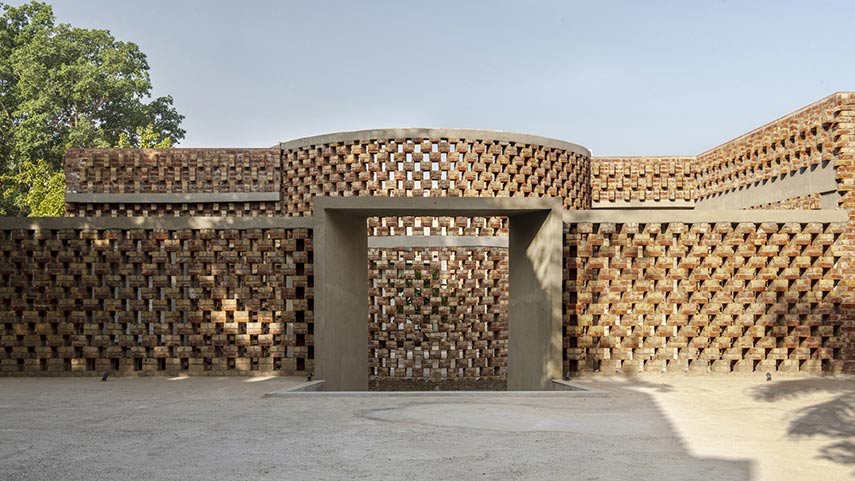 La maison conçue par les RLDA Architects occupe l'extrémité sud d'un terrain de 6780 m². Cette disposition a été déterminée en tenant compte de la topographie du terrain, de la présence d'un arbre existant et de l'existence d'une allée préalablement construite le long de la limite est. L'ensemble du projet se compose de quatre structures, principalement construites en briques : une salle de garde circulaire, une salle de pompe cuboïdale et deux blocs résidentiels
