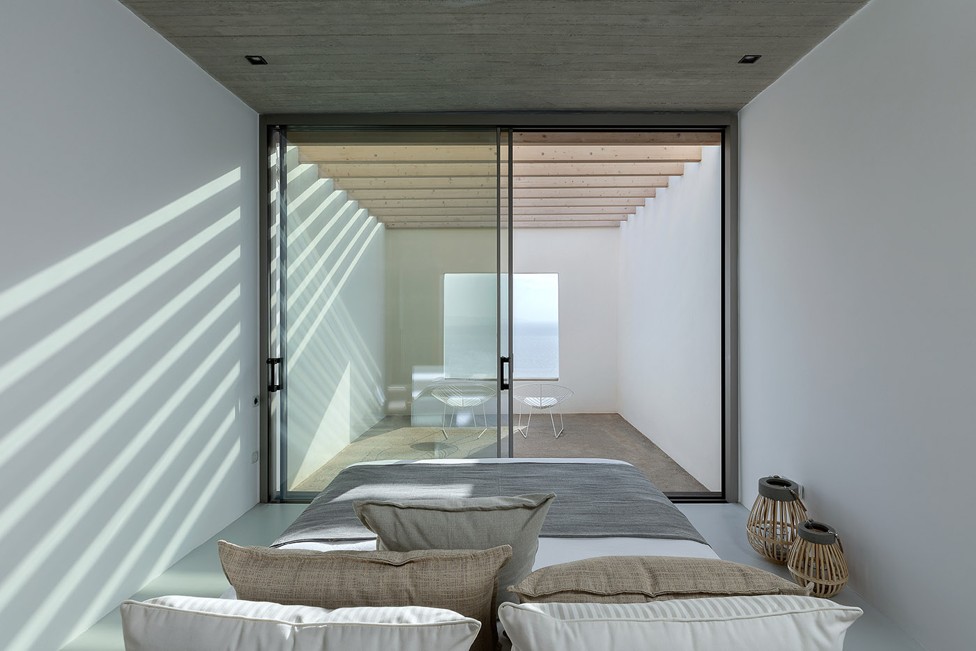 Le volume linéaire de la piscine qui émerge de la pente crée une tension qui part du bâtiment et se projette vers l'horizon. La palette de couleurs utilisée se fond dans le paysage, s'intégrant à celui-ci. Cependant, le bâtiment conserve toujours une force dynamique. L'habitant est invité à vivre une forte connexion avec la nature, plongé dans le décor de Ténos et de son paysage