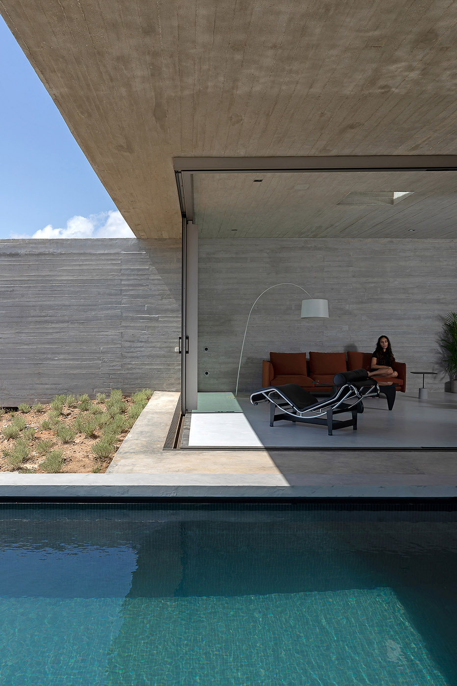 La couleur de l'eau de la piscine contraste avec la texture rocheuse du béton brut. Une dalle de béton semble être une extension du paysage en recouvrant les trois volumes du bâtiment, sculptant les formes architecturales de l'espace ouvert et fermé de la résidence