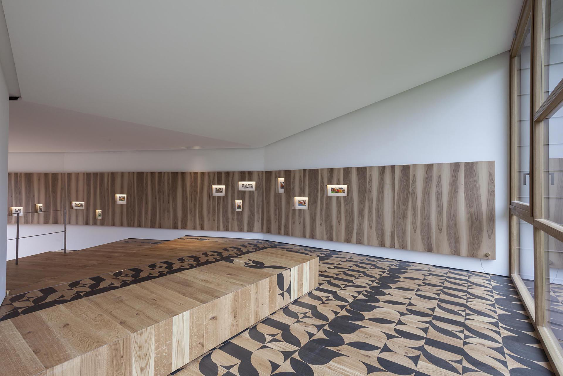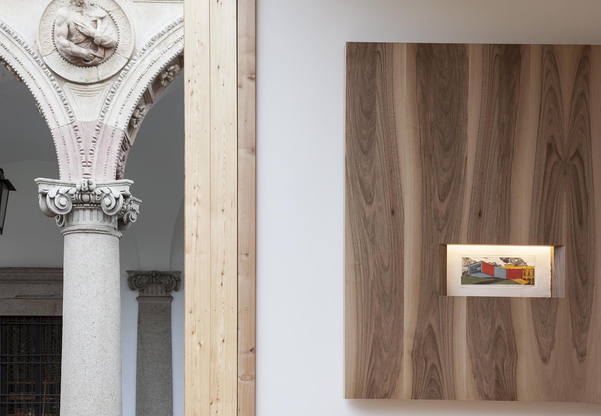 Une série de dessins et d'esquisses de gravures de ses origines sont installés à l'intérieur, sur un mur en bois, tandis qu'un banc sur lequel s'asseoir permet d'observer l'architecture extérieure du XVIIe siècle et en même temps une décoration abstraite et innovante sur le sol en bois