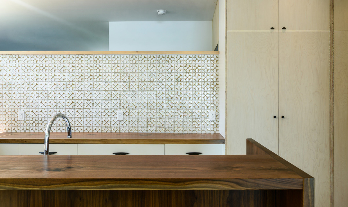 Low walls, on the other hand, define the interior spaces, which are characterized by different types of materials, such as tiles and walnut and birch wood. The wooden shutters, which are located all around the perimeter, can be opened