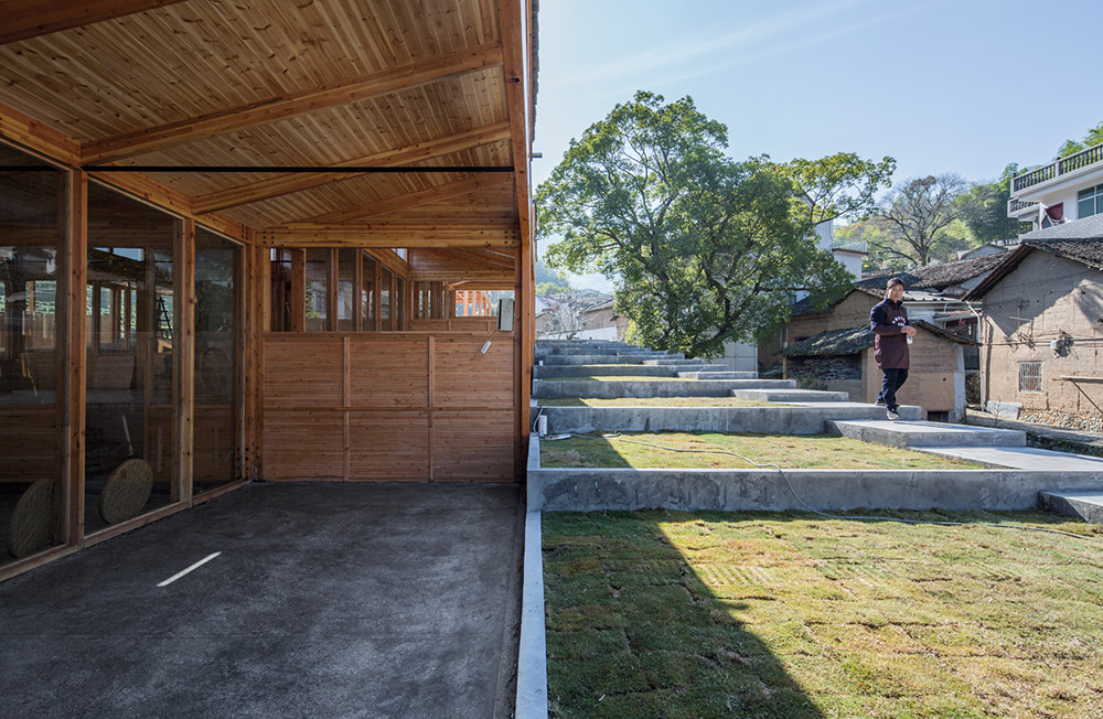 Pour observer le processus de production traditionnel du tofu dans l'ordre, il y a une passerelle couverte menant à la salle de dégustation, faisant face à une place ouverte au sud et à la partie historique du village de l'autre côté de la rivière. En fait, l'usine, en plus d'être un espace de production, offre également un espace d'exposition sur la production traditionnelle de tofu