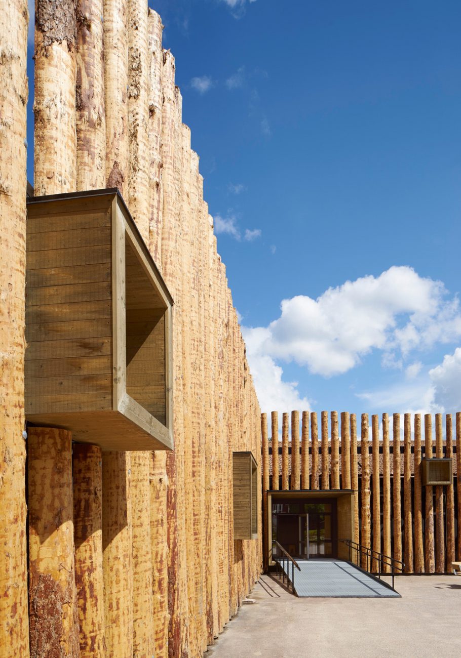 Around the old black painted façade is a wooden palisade that defines the new intended use of the building. This new layer represents the enclosure within which the museum can continue to expand, transforming the classrooms into new exhibition spaces