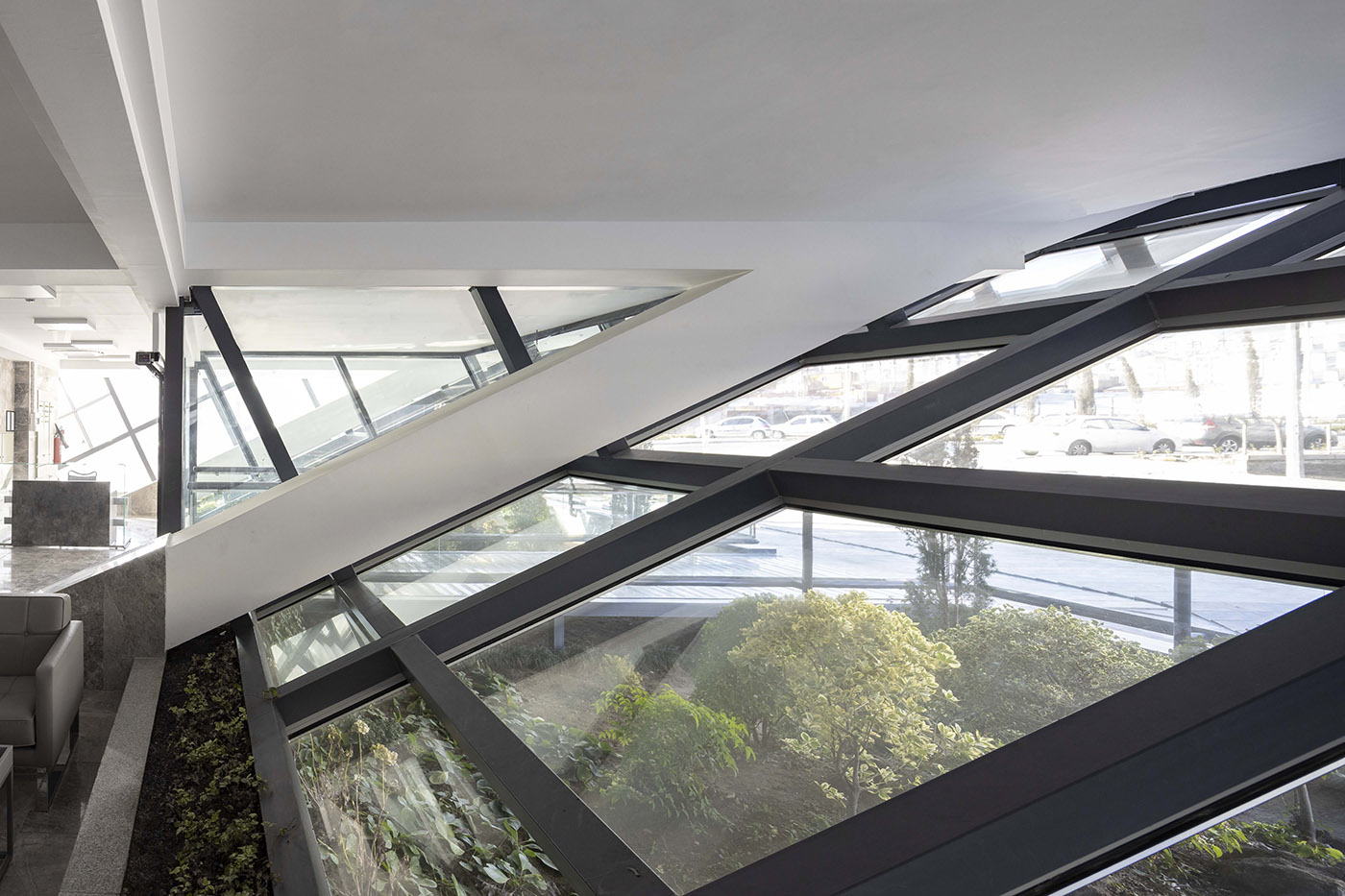 The cut-out roof creates a terrace that brings natural light and air inside, also forming an outdoor space shared by visitors and employees. The sloped roof is completely hollow in order to create a green corridor from the ground to the roof, by creating a dynamic space and reducing building temperature and energy consumption