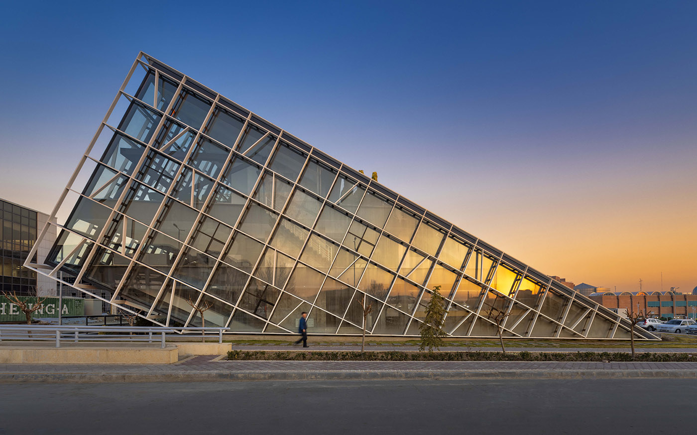 The exposed structure used for the interior recalls the characteristic structure of industrial buildings. The glass pyramid-shaped building is divided into five horizontal levels well connected vertically by a transparent elevator. The interior spaces are designed to enhance user interaction