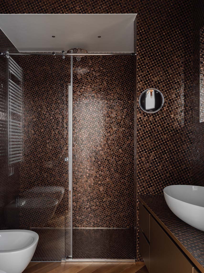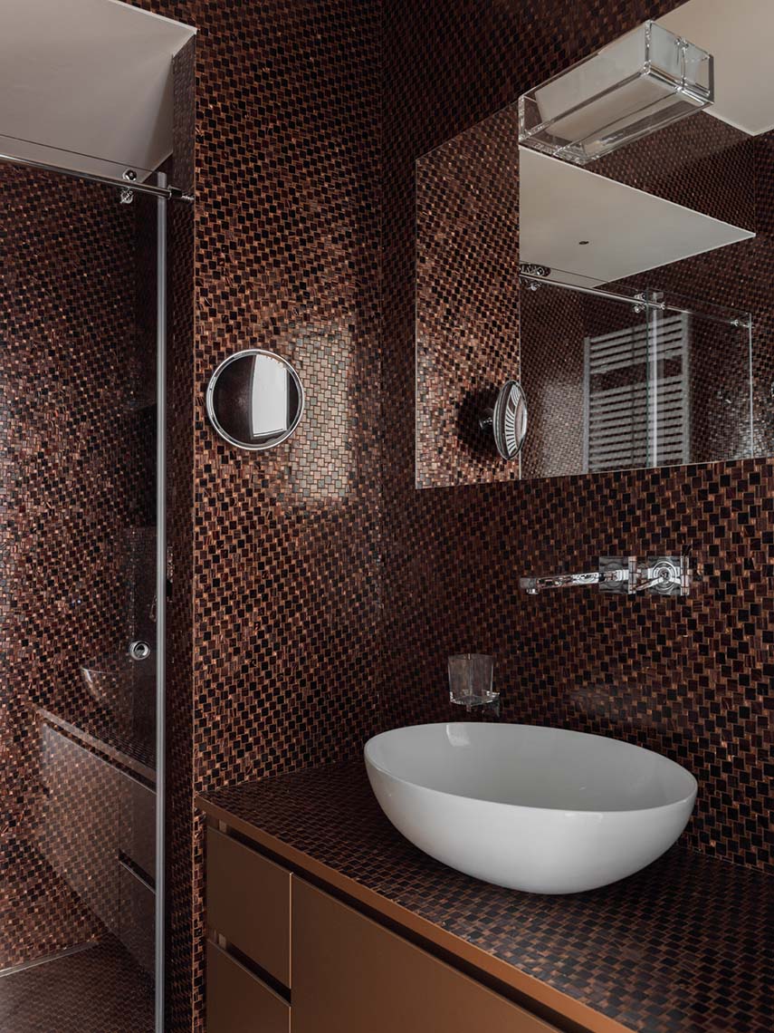 The design studio Arkispazio, led by Paolo Balzanelli and tasked with the Due Diabolos interior project, takes advantage of the central location of the entrance to optimally redistribute the apartment layout. The east side is dedicated to the sleeping area and accompanying amenities, leaving the west-facing portion, with its large windows overlooking the main balcony, for a spacious and bright living room with a kitchen