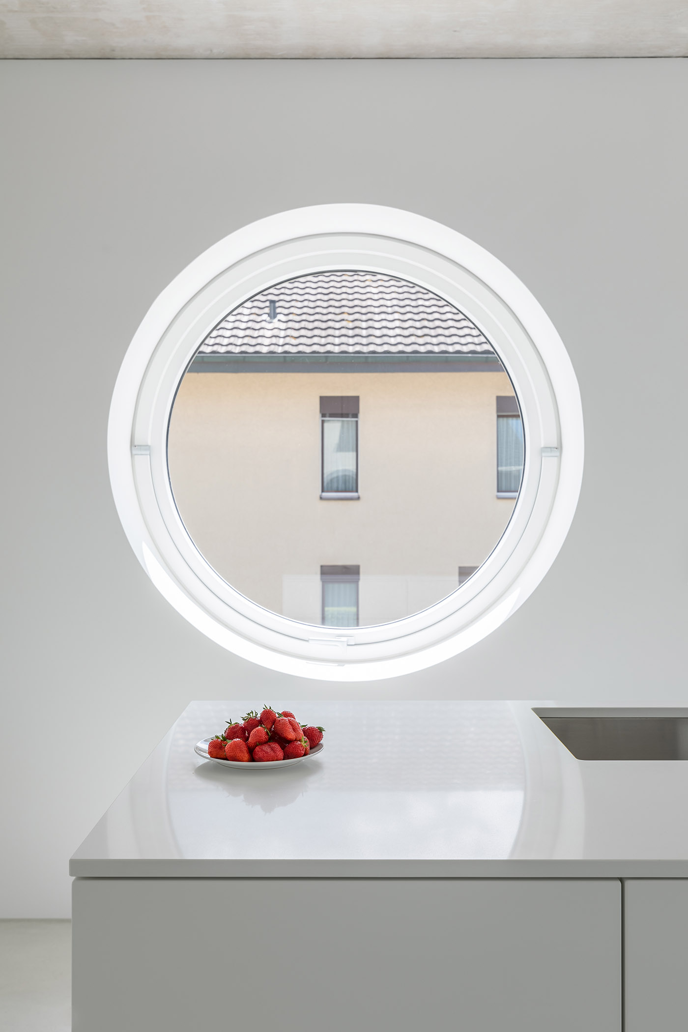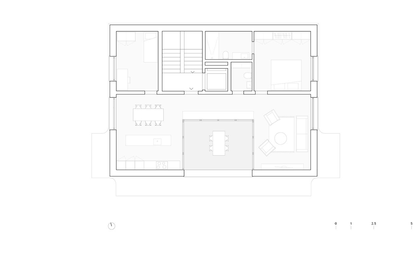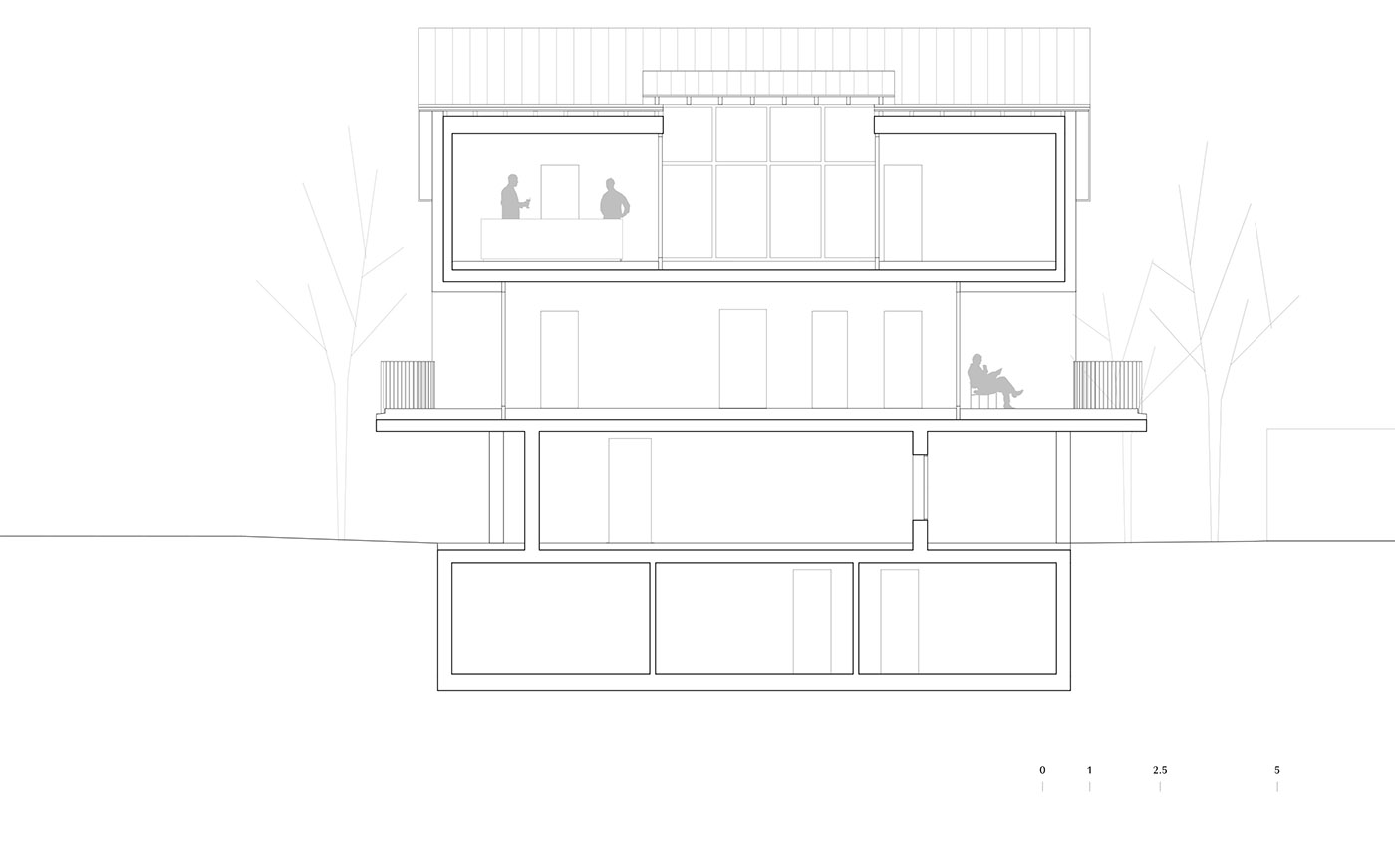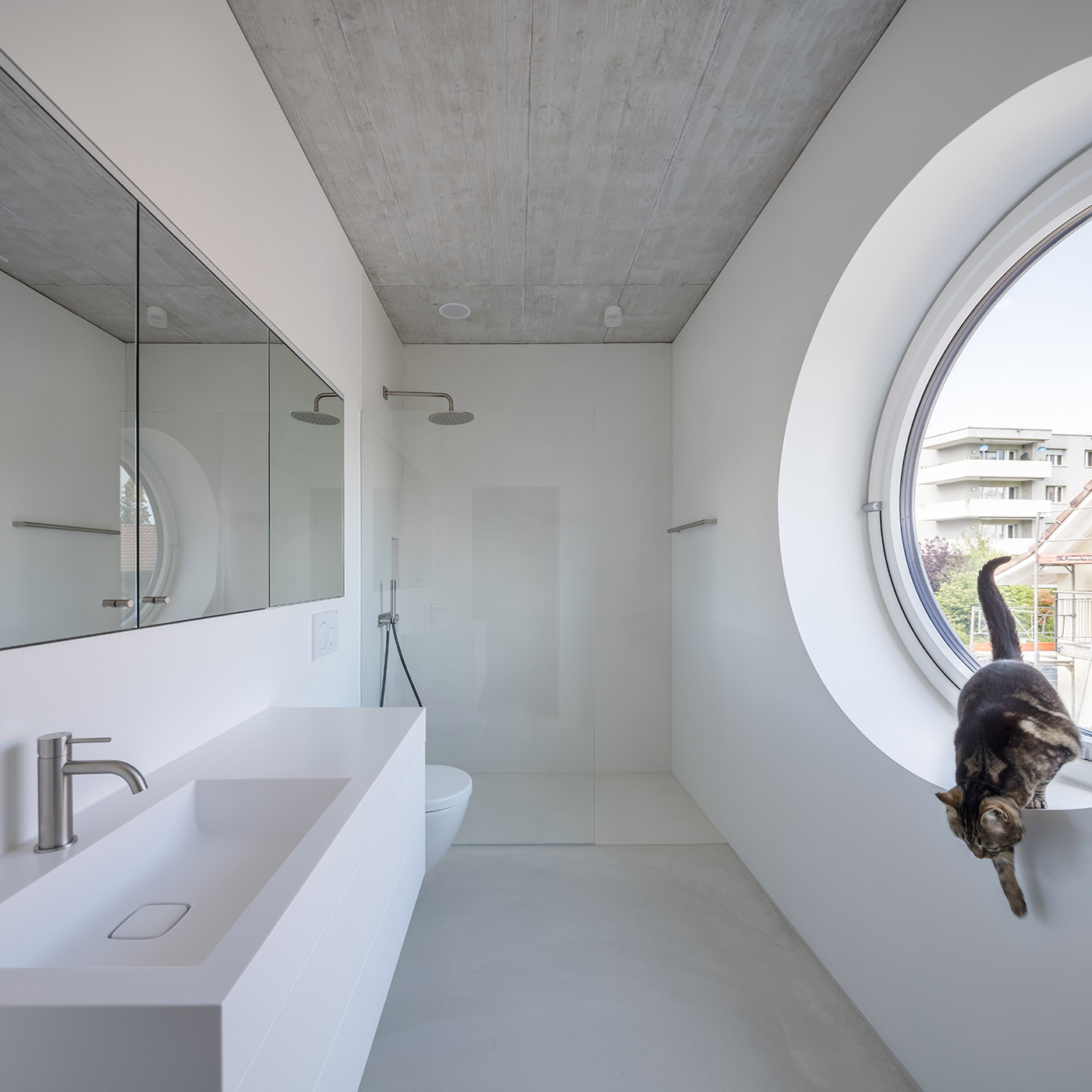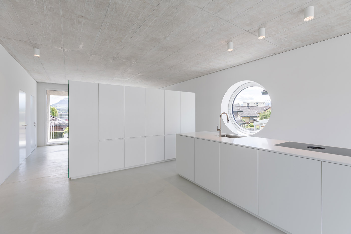 Designed by Atelier Brandau Ciccardini Architekten, the two-family house in Lucerne has a spatial structure clearly defined by its east-west orientation: a large terrace at the front of the house serves the social area, which arranged like a loggia, leads to a wide-open lighted space